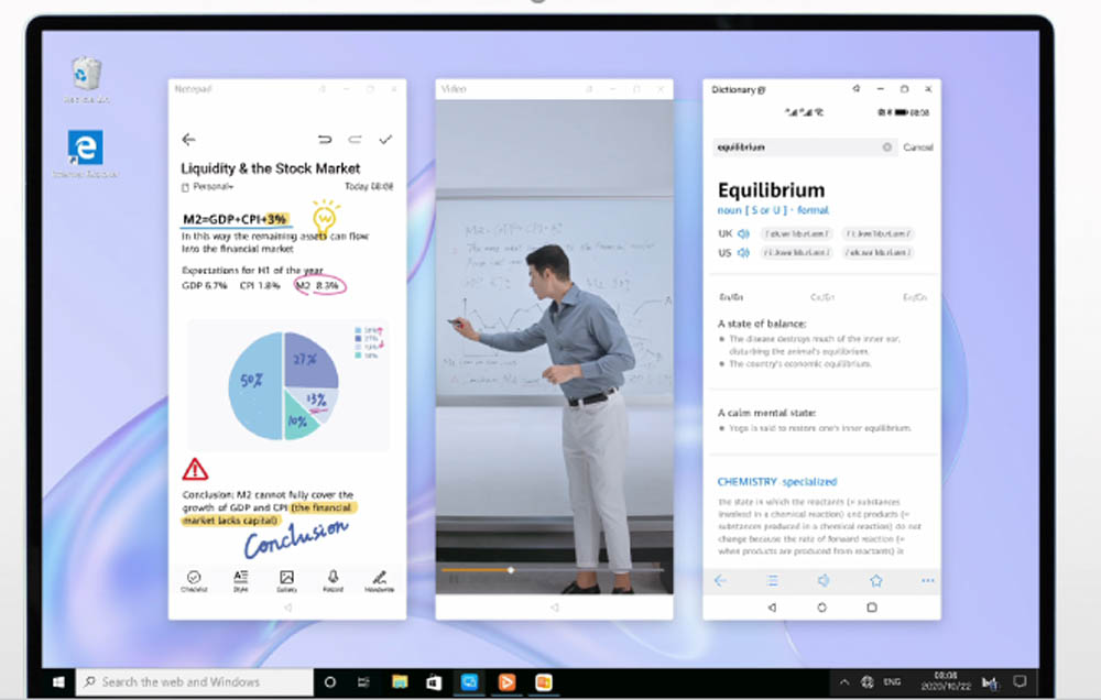 ยกตัวอย่างเช่น คนที่ชอบการทำงานแบบ Multi-tasking อาจจะเคยจินตนาการว่าอยากมีจอคอมพิวเตอร์แบบในภาพยนตร์ Sci-Fiที่ทำได้หลายอย่างในเวลาเดียวกัน คงน่าสนุกและเท่ไม่หยอก อันที่จริงแล็ปท็อปยุคนี้มีนวัตกรรมที่สามารถควบคุมสั่งการหลายหน้าจอได้พร้อมกันแล้ว ก็อาจจะเหมาะกับแล็ปท็อปของหัวเว่ยที่มีเทคโนโลยี HUAWEI Share ฟีเจอร์ที่ช่วยทำMulti-screen Collaboration โดยนำจอสมาร์ทโฟนขึ้นมาแสดงบนจอแล็ปท็อปได้เพียงแตะตัวสมาร์ทโฟนระบบปฏิบัติการล่าสุดคือ EMUI 10.1 ตรงบริเวณ Touchpad ล่าสุดได้ออกเวอร์ชัน 3.0 สามารถเปิดแอปพลิเคชันที่มีอยู่บนสมาร์ทโฟนให้ไปแสดงผลและใช้งานบนจอแล็ปท็อปแบบเรียลไทม์ได้มากถึง 3 แอปฯ 3 จอ ผู้ใช้ HUAWEI MateBook 14 ที่เป็นหน้าจอแบบ Multi-touch Screen ก็จะสามารถสนุกกับการแตะหน้าจอเพื่อเพิ่มหน้าต่างแอปฯ และลากข้อมูลต่างๆ ไปใช้หรือทำงานต่อบนเครื่องได้อย่างง่ายดาย