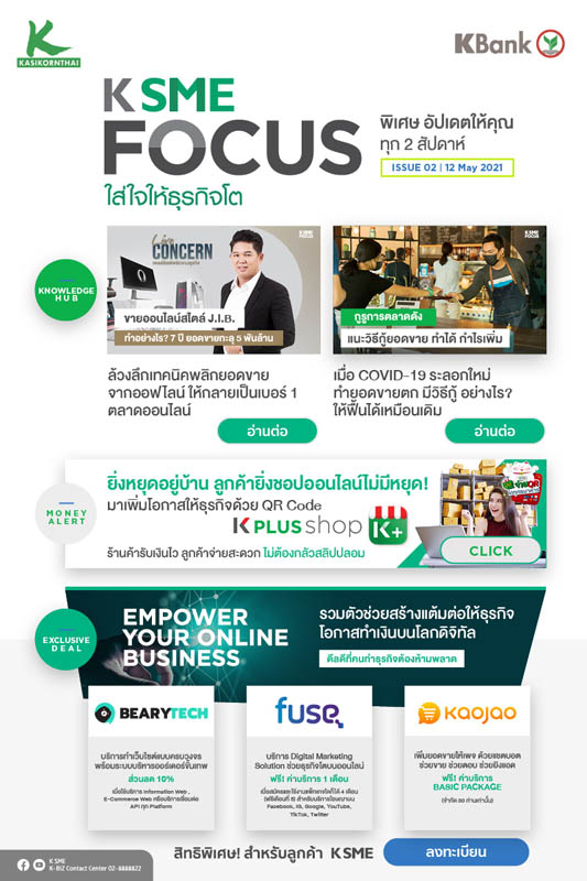 เมื่อโควิดตัวร้ายกลับมาระบาดอีกรอบ ธุรกิจต้องสร้างภูมิคุ้มกัน K SME FOCUS E-NEWS : ISSUE 2 ชวนอ่านกูรูการตลาดดังแนะวิธีกู้ยอดขายช่วงวิกฤต และเปิดเคล็ดลับขายออนไลน์อย่างไรให้ยอดขายทะลุพันล้าน สไตล์ J.I.B. Computer Group พร้อมรับสิทธิพิเศษจากธนาคารและพันธมิตรชั้นนำอีกมากมาย คลิก https://kbank.co/3eroi3l