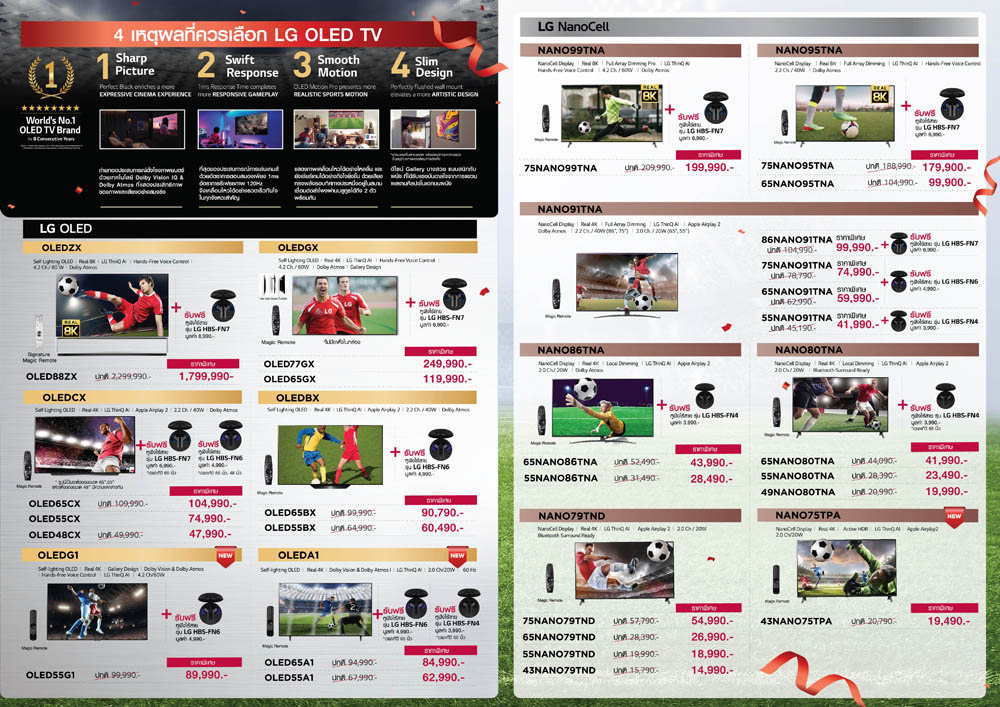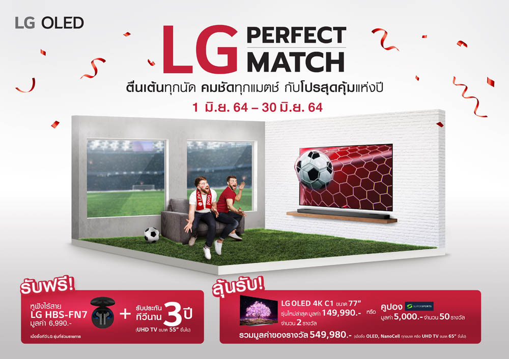 บริษัท แอลจี อีเลคทรอนิคส์ (ประเทศไทย) จำกัดจัดโปรชุดใหญ่รับมหกรรมการแข่งขันฟุตบอลศึกสำคัญของชาติยุโรป ส่งข้อเสนอพิเศษสำหรับผู้ที่ซื้อทีวี LG OLED, NanoCellและUHD รวมถึง 43 รุ่น ที่ร่วมรายการในแคมเปญ “LG Perfect Match” ให้คอบอลได้เชียร์ทีมโปรดบนทีวีใหม่แบบคมชัดทุกแมตช์ในแพ็คแกจสุดคุ้ม ลดราคาพิเศษสูงสุดถึง 20% พร้อมรับฟรี ประกันทีวีนาน 3 ปี (จากปกติ 1 ปี) และหูฟังไร้สายLG TONE Free นอกจากนี้ ผู้ที่ซื้อLG OLED TV, LG NanoCell TV ทุกขนาดหรือLG UHD TV ขนาด 65 นิ้วขึ้นไปรุ่นที่ร่วมรายการ ยังสามารถลุ้นรับโอกาสสุดพิเศษในการเป็นเจ้าของทีวี OLED 4K รุ่นใหม่ล่าสุดจากแอลจี ซีรี่ส์ C1 ขนาด 77 นิ้ว มูลค่า 149,990 บาท จำนวน 2 รางวัลหรือลุ้นรับบัตรกำนัลซูเปอร์สปอร์ตมูลค่า 5,000 บาท จำนวน 50 รางวัลรวม52 รางวัล มูลค่าทั้งหมด 549,980 บาทเมื่อซื้อทีวีรุ่นที่ร่วมรายการระหว่างวันที่ 1-30 มิถุนายน 2564 และลงทะเบียนรับสิทธิ์ผ่านเว็บไซต์ https://lgpromotion-th.com/lg-perfect-match ภายในวันที่
