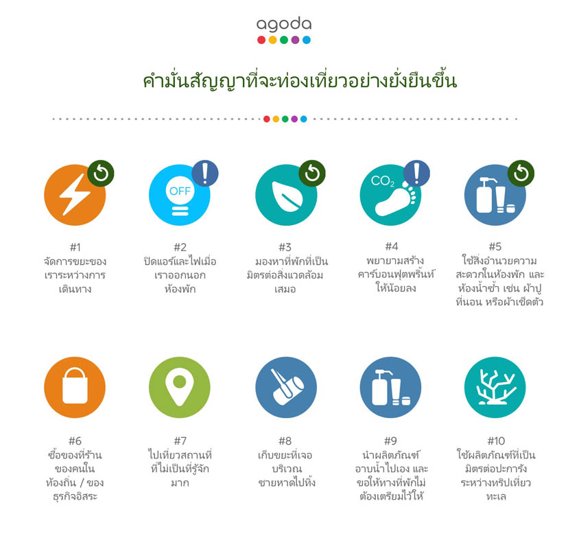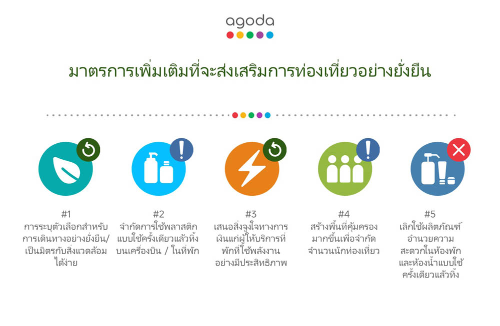ผลสำรวจในหัวข้อ เทรนด์การท่องเที่ยวอย่างยั่งยืน 2021 ซึ่งจัดทำโดยอโกด้า รายงานว่า 1.) ระบุตัวเลือกการท่องเที่ยวที่เป็นมิตรต่อสิ่งแวดล้อมได้ง่าย 2.) จำกัดการใช้พลาสติกแบบใช้ครั้งเดียวแล้วทิ้ง 3.) เสนอสิ่งจูงใจทางการเงินแก่ผู้ให้บริการที่พักที่ใช้พลังงานอย่างมีประสิทธิภาพ คือสามมาตรการเสริมที่นักท่องเที่ยวลงความเห็นว่าน่าจะส่งผลดีต่อการท่องเที่ยวแบบยั่งยืน นอกจากนี้ยังมีมาตรการอย่าง 4.) สร้างพื้นที่คุ้มครองให้มากขึ้นเพื่อจำกัดจำนวนนักท่องเที่ยว และ 5.) เลิกใช้ผลิตภัณฑ์อำนวยความสะดวกในห้องพักและห้องน้ำแบบใช้ครั้งเดียวแล้วทิ้ง เป็นมาตรการที่นักท่องเที่ยวให้ความสำคัญมากที่สุดตามลำดับ