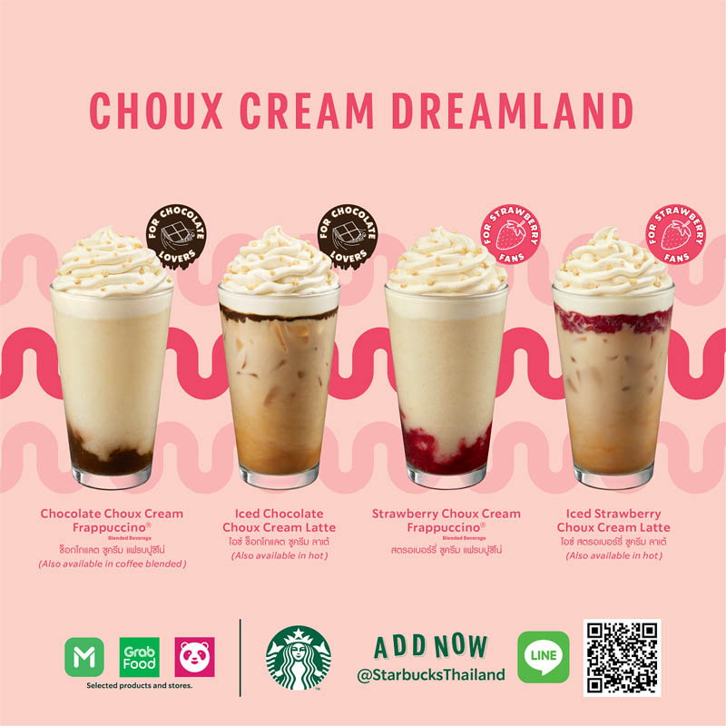 สตาร์บัคส์ ประเทศไทย เปิดตัวเครื่องดื่ม2 รสชาติใหม่ที่ได้แรงบัลดาลใจมาจากชู ครีม ขนมสุดคลาสสิคจากฝรั่งเศสพร้อมส่งตรงถึงบ้านกับช็อกโกแลตชูครีม แฟรบปูชิโน่ (Chocolate Choux Cream Frappuccino®) เครื่องดื่มปั่นรสวานิลลาและคัสตาร์ดเนียนนุ่ม ท็อปด้วยซอสช็อกโกแลตเข้มข้น เสิร์ฟพร้อมวิปครีมรสรสวานิลลาคัสตาร์ดพิเศษและโรยด้วยเกรแฮมแครกเกอร์กรอบ เครื่องดื่มสุดพิเศษนี้ยังมีให้เลือกในรสสตรอเบอร์รี่ให้ลูกค้าได้สดชื่นไปกับสตรอเบอร์รี่ ชู ครีม แฟรบปูชิโน่ (Strawberry Choux Cream Frappuccino®) เครื่องดื่มสูตรครีมปั่นผสมวานิลลาและซอสตาร์ดที่มาพร้อมซอสตรอเบอร์รี่หอมหวาน ท็อปด้วยวิปครีมวานิลลาคัสตาร์ดและเกรแฮมแครกเกอร์เช่นกัน โดยนอกจากสูตรปั่นแล้ว เมนูเครื่องดื่มชู ครีมยังมีให้เลือกทั้งแบบร้อนและเย็น ในรูปแบบของชู ครีม ลาเต้ โดยจะเริ่มจำหน่ายตั้งแต่วันนี้ถึง26 กรกฎาคมนี้ ที่ร้านสตาร์บัคส์ทุกสาขาทั่วประเทศ