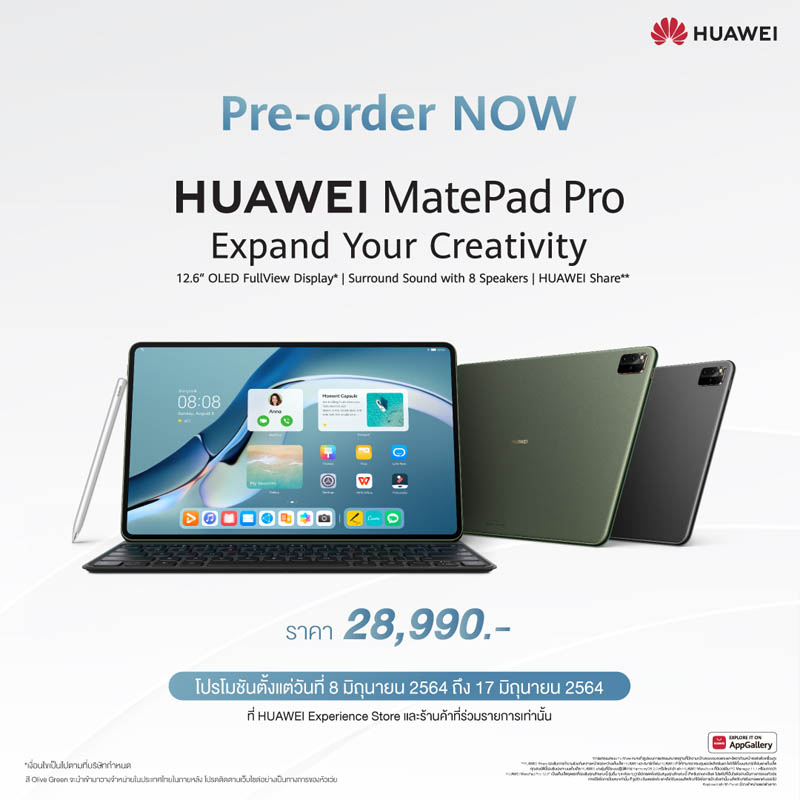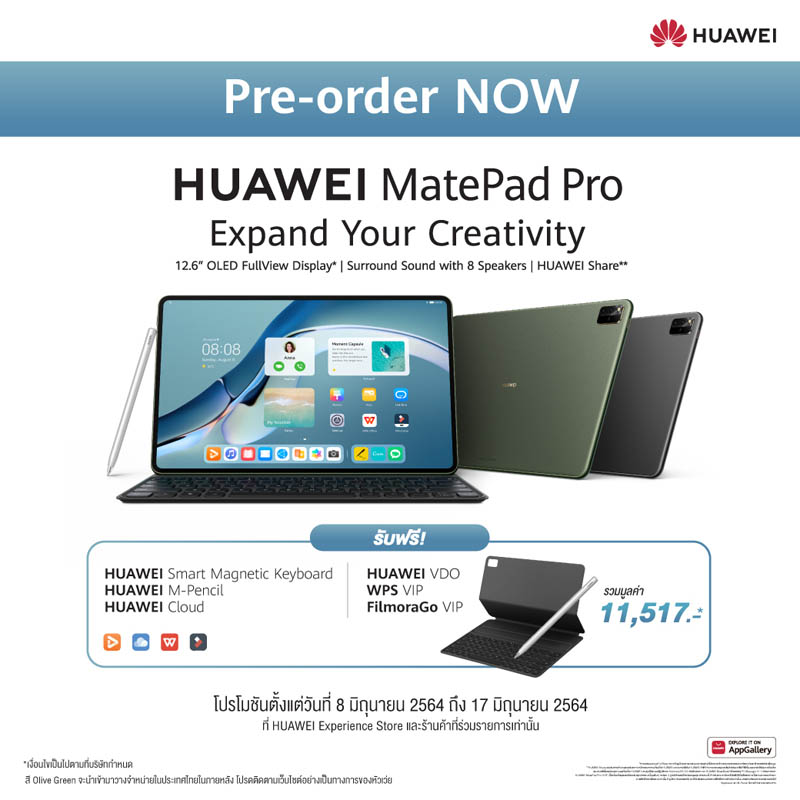 ย้ำกันอีกสักรอบก่อนหมดช่วงโปรโมชันสำหรับพรีออเดอร์ HUAWEI MatePad Pro 12.6-inch มีเฉพาะสี Matte Grey รับทันทีของสมนาคุณ มีตั้งแต่ HUAWEI Smart Magnetic Keyboard, HUAWEI M-Pencil, HUAWEI Cloud, HUAWEI VDO, WPS VIP และ FilmoraGo VIP มูลค่ารวม 11,517 บาท ตั้งแต่วันที่ 8 มิถุนายน 2564 ถึง 17 มิถุนายน 2564 เมื่อซื้อผ่าน HUAWEI Experience Store และร้านค้าที่ร่วมรายการเท่านั้น จับจองก่อนใครได้ที่https://bit.ly/2TigJUz