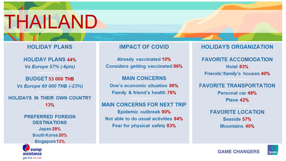 44% ของนักท่องเที่ยวชาวไทยวางแผนท่องเที่ยวในวันหยุดช่วงเดือนมิถุนายนถึงกันยายน 2564 นี้ แต่จาก 64% ในจำนวนดังกล่าวยังไม่ตัดสินใจว่าจะเดินทางท่องเที่ยวในประเทศหรือต่างประเทศ เช่นเดียวกับนักท่องเที่ยวชาวอเมริกันที่ยังไม่ตัดสินใจเลือกจุดหมายปลายทางท่องเที่ยวจำนวน 47% ในขณะที่นักท่องเที่ยวชาวยุโรป (อิตาลี 61% สเปนและฝรั่งเศส 54%) และชาวจีน 61% เลือกวางแผนเดินทางท่องเที่ยวภายในประเทศของตน นอกจากการวางแผนท่องเที่ยวในปีนี้แล้ว นักท่องเที่ยวส่วนใหญ่ต้องการที่จะเดินทางไปกับคนสนิท โดยเลือกที่จะท่องเที่ยวกับครอบครัว คนรัก และลูกหลาน หลังจากการเว้นระยะห่างทางสังคมเป็นเวลาหลายเดือน มาตรการด้านความปลอดภัยยังคงเป็นปัจจัยสำคัญสำหรับนักท่องเที่ยวชาวไทย โดยพบว่านักท่องเที่ยวชาวไทยวางแผนท่องเที่ยวในสถานที่ท่องเที่ยวตามธรรมชาติและห่างไกลผู้คน โดยเลือกเดินทางไปทะเล 57% ภูเขา 40% และอีก 34% วางแผนเดินทางไปต่างจังหวัดมากกว่าสถานที่ท่องเที่ยวที่คนพลุกพล่านอย่างในตัวเมือง อีกเทรนด์ที่น่าสนใจ คือ นักท่องเที่ยวที่ตอบแบบสอบถามกว่า 81% วางแผนซื้อประกันการเดินทางในอนาคตซึ่งเพิ่มขึ้นถึง 11% จากปีที่แล้ว ที่มีจำนวน70%