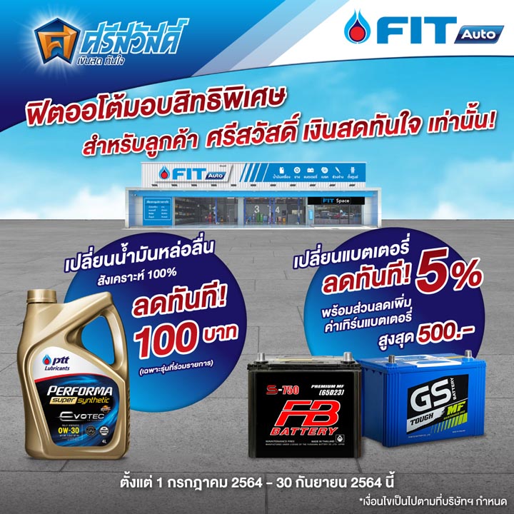 FIT Auto จับมือบริการศรีสวัสดิ์ เงินสดทันใจ ร่วมมอบสิทธิพิเศษสำหรับลูกค้าศรีสวัสดิ์ ให้ได้ฟิตรถกันสะดวกแถมคุ้มค่ามากขึ้น เมื่อมาใช้บริการศูนย์บริการยานยนต์ FIT Auto วันนี้ รับส่วนลดทันที 100 บาท สำหรับบริการเปลี่ยนน้ำมันหล่อลื่นสังเคราะห์ 100% (เฉพาะรุ่นที่ร่วมรายการ) และส่วนลดบริการเปลี่ยนแบตเตอรี่ 5% พร้อมส่วนลดค่าเทิร์นแบตเพิ่มสูงสุด 500 บาท สำหรับแบตเตอรี่ทุกรุ่น ตั้งแต่วันนี้ – 30 กันยายน 2564 ที่ FIT Auto ทุกสาขาทั่วประเทศ โดยเงื่อนไขโปรโมชั่นเป็นไปตามที่บริษัทฯกำหนด