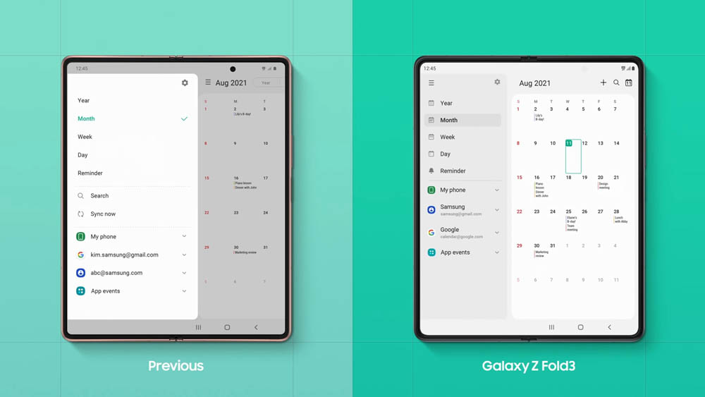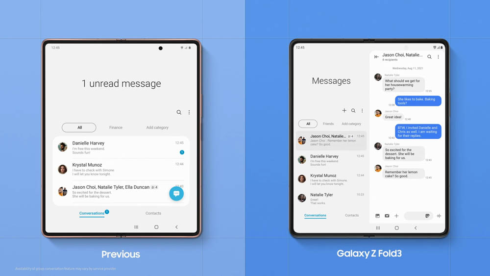 แอปพลิเคชันด้านการทำงาน รวมถึงแอปพลิเคชันที่ผู้ใช้นิยมใช้งานเป็นประจำ ได้ถุกออกแบบให้ใช้งานได้ง่ายขึ้นใน Galaxy Z Fold3 5G เช่น แอปพลิเคชันส่งข้อความ ก่อนหน้านี้ คุณต้องทำการปิดแชทหนึ่งก่อนเปิดใช้งานอีกแชท แต่ตอนนี้ด้วยหน้าจอขนาดใหญ่ ทำให้ลิสต์กลุ่มแชทจะปรากฏขึ้นทางด้านซ้าย และข้อความจะแสดงทางด้านขวา ทำให้เห็นทุกอย่างได้พร้อมกันในครั้งเดียว หรือแม้กระทั่งแอปพลิเคชันปฏิทิน สำหรับการดูตารางงานต่างๆ เมื่อก่อนนี้ แผงเมนูจะรบกวนสายตายามที่เราเลือกใช้ และทำให้พื้นที่บนหน้าจอลดลง แต่ด้วย UI 3.1.1 ทุกอย่างได้รับการจัดวางอย่างเป็นระเบียบ ใช้งานง่ายและชัดเจน