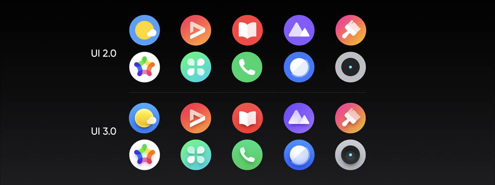 เรื่องแรกเลย คือ ไอคอนผ่านการดีไซน์ใหม่เป็นภาพ 3D ที่ดูสดใสมากยิ่งขึ้น โดยเน้นเส้นขอบที่ชัดเจน ผสานการใช้โทนสีแบบกึ่งโปร่งแสง เพื่อเพิ่มความสวยงามสบายตาและดูมีชีวิตชีวาสไตล์คนรุ่นใหม่ ทำให้รูปลักษณ์ไอคอนโดยรวมมีสีสันเจิดจ้าสะดุดตา และให้มุมมมองที่ดูมีมิติยิ่งขึ้น เมื่อเปรียบเทียบกับ UI 2.0 จะเห็นว่าไอคอนใหม่ให้ขอบเขตสีที่กว้างกว่า จึงสามารถเลือกให้เหมาะสมกับบุคลิกของผู้ใช้แต่ละคนได้หลากหลายมากขึ้น