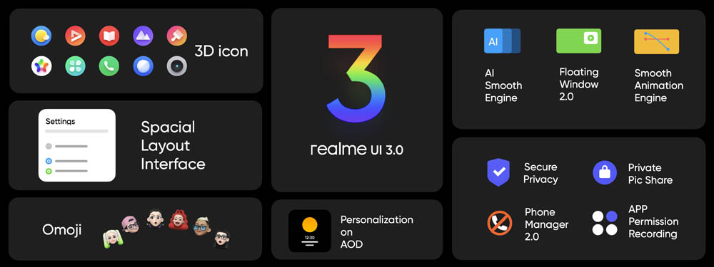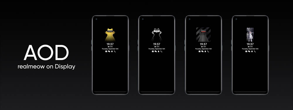 realme UI ให้ความสำคัญกับการปรับแต่งหน้าจอตามบุคลิกผู้ใช้งานเสมอ ทั้งไอคอน พื้นหลัง ตัวหนังสือ และองค์ประกอบอื่น ๆ และใน realme UI 3.0 รองรับการปรับแต่งธีมสีแบบสากล เพื่อให้ผู้ใช้เลือกโทนสีที่โดนใจได้ตามใจ รวมถึงการอัปเกรด AOD ( Always-On Display) เพื่อให้ผู้ใช้นำภาพโปรดมาทำเป็นภาพหน้าจอได้อย่างง่ายดาย หรือเลือก AOD ดีไซน์ realmeow (เรียวเหมียว) มัสคอตสุดน่ารักของแบรนด์ ให้คุณแสดงตัวตนที่โดดเด่นได้ไม่เหมือนใคร!