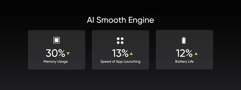 realme UI 3.0 ได้มีการนำเสนอ AI เพื่อการทำงานที่ราบรื่นในทุกฟีเจอร์และช่วยลดการใช้พลังงานแบตเตอรี่ตั้งแต่ระดับพื้นฐาน รวมถึงอัตราการใช้งานหน่วยความจำก็ถูกยกระดับประสิทธิภาพ ลดช่องว่างการบันทึกข้อมูลในหน่วยความจำ และ AI ยังช่วยบีบอัดหน่วยความจำเพื่อให้สามารถเปิดโปรแกรมการทำงานที่แตกต่างกันได้อย่างราบรื่น รวมถึงการจัดลำดับการใช้ทรัพยากรอย่างเหมาะสม ปัจจัยเหล่านี้ช่วยลดการใช้หน่วยความจำเครื่องได้ถึง 30% เพิ่มประสิทธิภาพการเปิดแอปพลิเคชันในภาพรวมได้ถึง 10% และเพิ่มอายุแบตเตอรี่ได้ถึง 12%