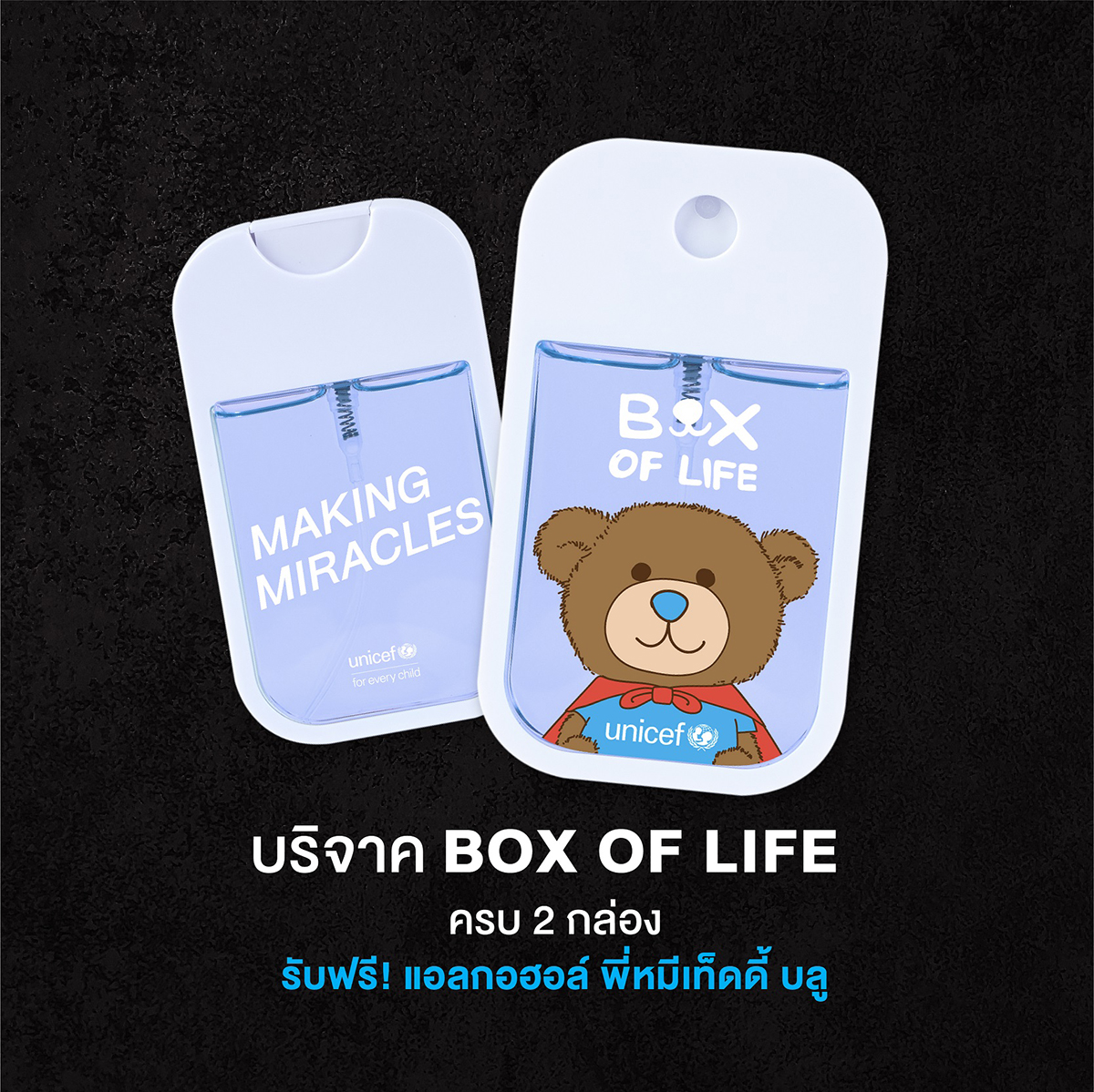 กล่อง Box of Life แต่ละกล่องมีมูลค่ากล่องละ 799 บาท โดยผู้บริจาคที่สนับสนุน 2 กล่อง หรือ 1,598 บาท จะได้รับสเปรย์แอลกอฮอล์ (แบบเติมได้) และหากผู้บริจาคต้องการช่วยเหลือเด็ก ๆ ทุกด้าน สามารถสนับสนุนกล่อง “Box of Life แบบ Box Set” มูลค่า 2,999 บาท จะได้รับกระเป๋า Shopping ขนาดใหญ่ลายพี่หมีเท็ดดี้ บลู Limited Edition เป็นของที่ระลึก นอกจากนี้ยังสามารถบริจาคแบบระบุจำนวนเงินตามต้องการได้