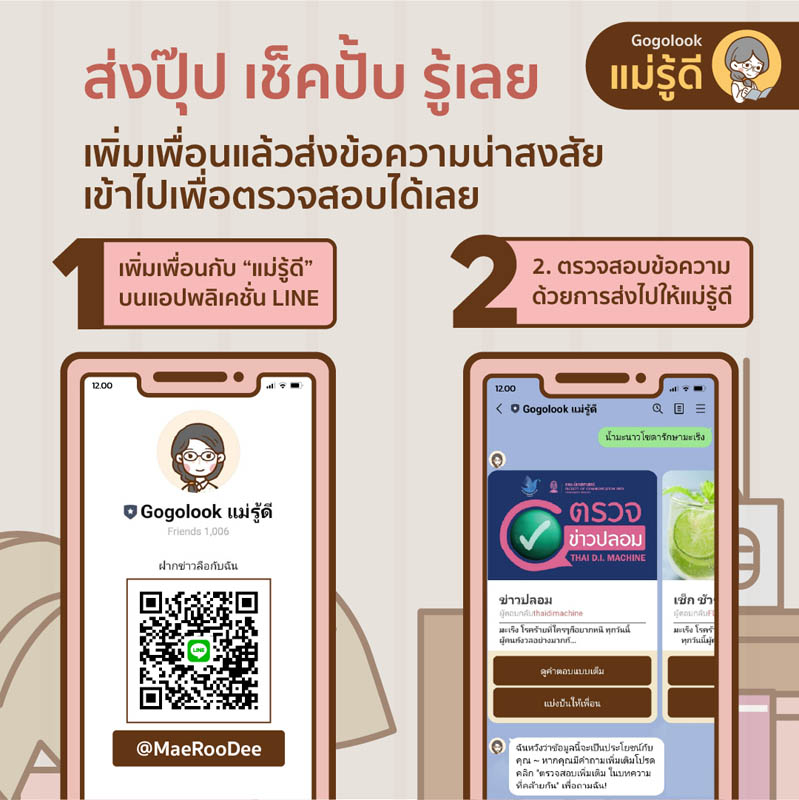 มาร่วมต่อต้านข้อมูลเท็จกันตั้งแต่วันนี้ โดยให้แม่รู้ดีช่วยตรวจสอบข้อเท็จจริง เพียงแค่เสิร์ชไอดี @maeroodee บน LINE แล้วเพิ่มเพื่อนในแชทและเชิญเข้ากลุ่ม LINE ของคุณ