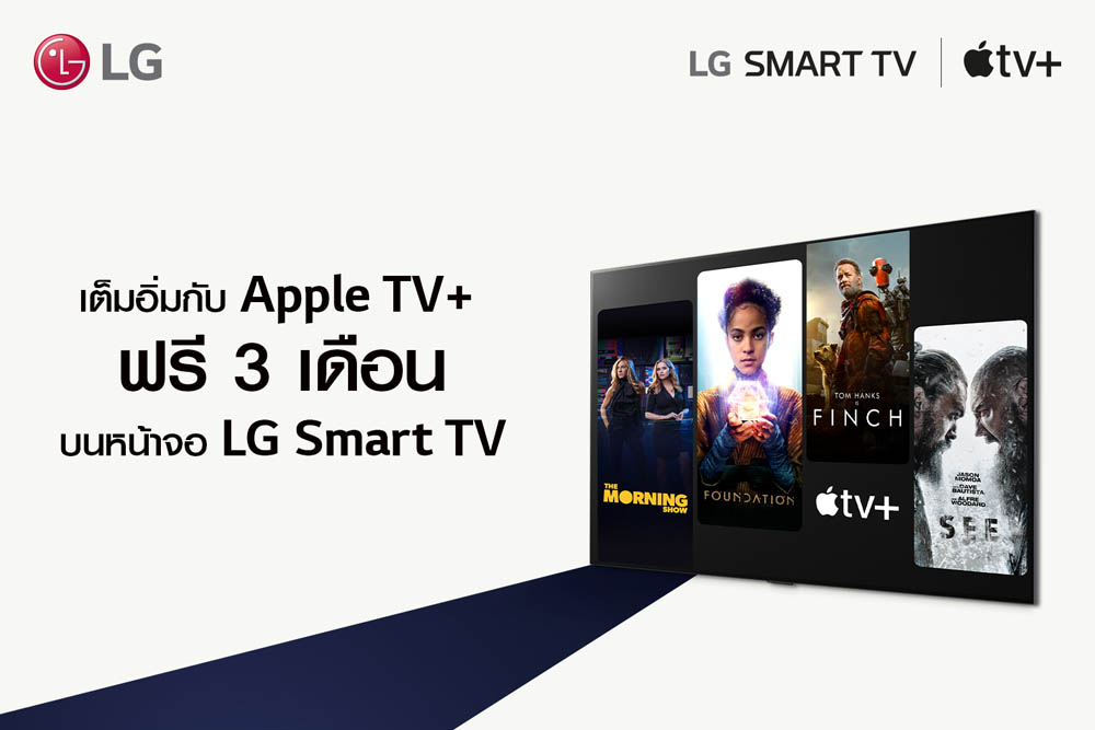 แอลจีมอบตัวเลือกความบันเทิงที่มากขึ้นบนจอ LG Smart TV ด้วยข้อเสนอสุดพิเศษสำหรับผู้ที่ใช้งาน LG Smart TV รุ่นที่วางจำหน่ายตั้งแต่ปี 2016 ถึงปี 2021 และลูกค้าใหม่ รับชม Apple TV+ ฟรี 3 เดือน ในระบบ Dolby Vision IQ และ Dolby Atmos เพื่อประสบการณ์ดั่งโรงภาพยนตร์ ตั้งแต่วันนี้ถึง 13 กุมภาพันธ์ 2565 เพลิดเพลินไปกับภาพยนตร์มากมายที่ได้รับรางวัลระดับโลกอย่าง The Morning Show, Foundation, Finch, See และอื่นๆ ค้นพบคอนเทนต์ที่หลากหลายได้ด้วยการสั่งงานผ่านเสียง หรือชี้ คลิก และเลื่อนเมจิกรีโมทของแอลจี และยังพร้อมให้บริการแก่สมาชิก Apple Music โดยสามารถเข้าถึงประสบการณ์ฟังและความบันเทิงขั้นสูงสุดผ่านจอ LG Smart TV ได้แล้วตั้งแต่วันนี้เป็นต้นไป