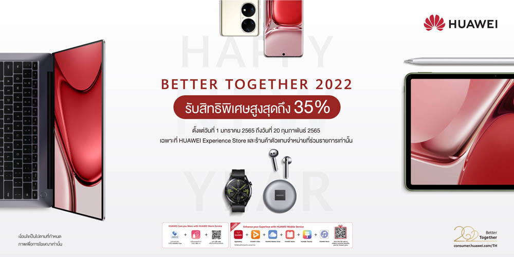 มาเสริมความเฮงให้ครบจบทุกมิติกับดีลสุดพิเศษของหัวเว่ยจากแคมเปญ BETTER TOGETHER 2022 ที่ยกขบวนแก็ดเจ็ตไอทีเสริมเฮงรับตรุษจีนปีนี้มาเพียบ พร้อมส่วนลดสูงสุดถึง 35% และของสมนาคุณแบบจัดเต็ม สำหรับใครที่สนใจ อย่ารอช้าเพราะโปรสุดพิเศษนี้มีเฉพาะวันที่ 1 มกราคม 2565 ถึง 20 กุมภาพันธ์ 2565 เมื่อซื้อสินค้าที่ HUAWEI Experience Store และ ร้านค้าตัวแทนจำหน่ายที่ร่วมรายการเท่านั้น