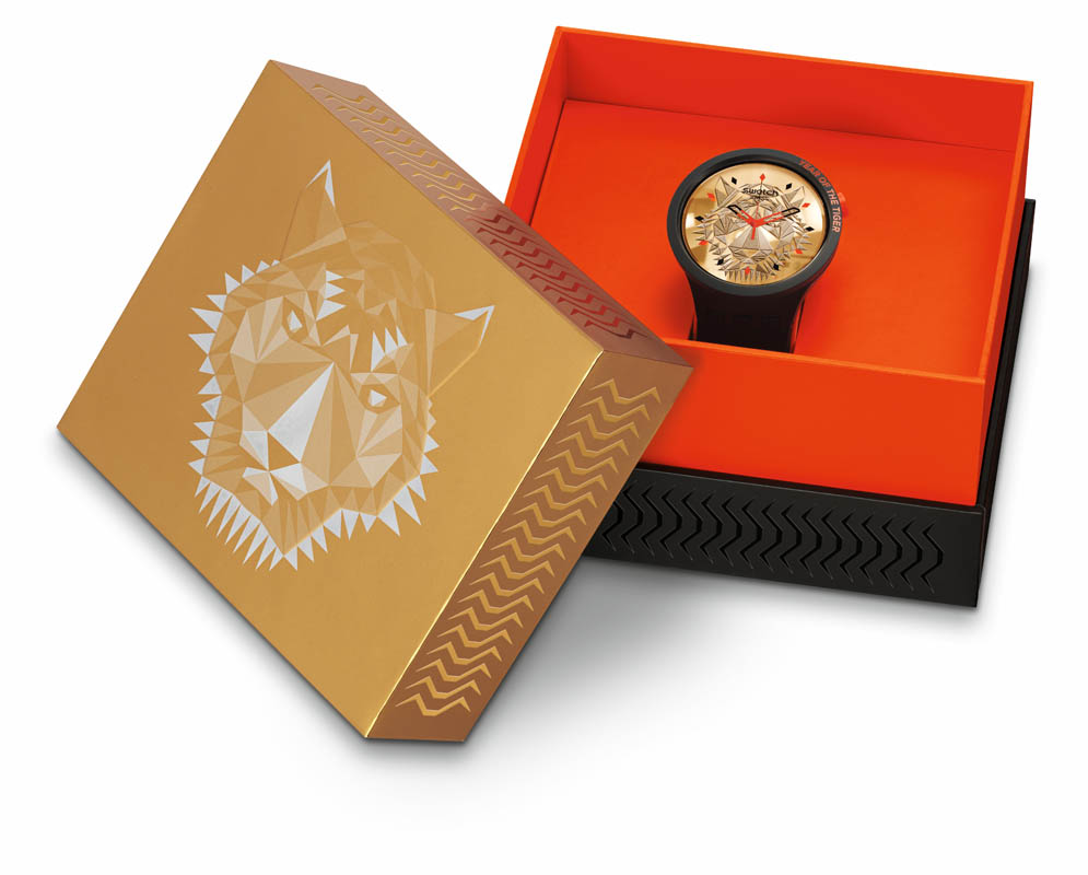 นอกจากนี้ Swatch ยังได้ให้ความสำคัญกับรายละเอียดเล็ก ๆ น้อย ๆ รอบตัวเรือนนาฬิกาด้วยเช่นกัน ไม่ว่าจะเป็นการใส่ข้อความ ‘YEAR OF THE TIGER’ ไว้บนกรอบหน้าปัด และประทับคำศัพท์ภาษาจีนอย่างคำว่า 虎年 ซึ่งแปลว่า ‘ปีเสือ’ ที่บริเวณด้านในของสายนาฬิกาไว้อย่างมีสไตล์ไม่ซ้ำใคร
