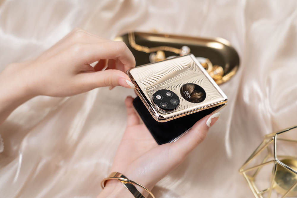 นอกจากเรื่องเทคโนโลยี ฟีเจอร์ด้านการดีไซน์ตัวเครื่องก็ถือเป็นสิ่งสำคัญมากสำหรับสมาร์ทโฟนพับได้ เพราะแน่นอนว่าคนจะเลือกสมาร์ทโฟนพับได้นั้นเรื่องดีไซน์นับเป็นหนึ่งในสิ่งสำคัญ จุดที่ต้องจับตามองก็คือเมื่อพับเก็บแล้ว ตัวเครื่องควรมีความบางเบากระทัดรัดหรือไม่ รวมทั้งควรมีดีไซน์บอดี้ตัวเครื่องที่สวยงามเพื่อช่วยให้ดูกลมกลืนไปกับทุกสไตล์การแต่งตัวของเรา ซึ่งพูดเลยว่าล่าสุด HUAWEI P50 Pocket นี่ทำได้ดีเลยทีเดียว เพราะตอนพับจะบาง 15.2 มม. ยิ่งพอกางออกก็บางเพียง 7.2 มม. เท่านั้น แถมยังเบาแค่ 190 กรัม นอกจากนี้ ด้านหลังของตัวเครื่องสีทองรุ่นพรีเมี่ยมที่ออกแบบด้วยดีไซเนอร์ชื่อดัง Iris Van Herpen ยังเคลือบด้วยกระจกบางเพียง 0.5 มิลลิเมตร พร้อมลวดลายอัญมณีแบบสามมิติที่ดึงดูดทุกสายตา ที่ออกแบบบนพื้นฐานความสมดุลระหว่างเทคโนโลยีและธรรมชาติให้สวยงามพร้อมมอบความหรูหราในเวลาเดียวกัน
