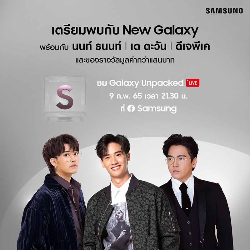 นับถอยหลังเข้าสู่ก้าวต่อไปของนวัตกรรมสมาร์ทโฟนกับงาน Samsung Galaxy Unpacked ซึ่งครั้งนี้พิเศษกว่าที่เคย เพราะซัมซุงพา เต ตะวัน และนนท์ ธนนท์ มาร่วมสร้างสีสันความสนุกให้ถึงหน้าจอผ่านมินิคอนเสิร์ตและกิจกรรมอีกมากมาย ก่อนเข้ารับชมการเปิดตัว The New Galaxy แบบภาษาไทยเอาใจเหล่ากาแลคซี่แฟน นอกจากนี้ ผู้ชมทุกท่านยังมีสิทธิ์ลุ้นรับสมาร์ทโฟนรุ่นล่าสุดไปใช้แบบฟรีๆ และของรางวัลมูลค่ากว่า 1 แสนบาท ภายในงานอีกด้วย