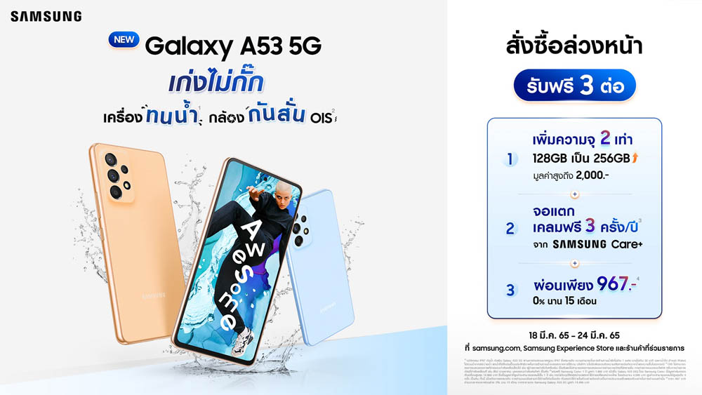 หนุ่มไบร์ทมาชวนถึงขนาดนี้ แฟนๆ จะไม่ซื้อได้หรอ? โค้งสุดท้ายกับสั่งซื้อ Galaxy A53 5G ล่วงหน้าตั้งแต่วันนี้ – 24 มีนาคม 2565 ที่ samsung.com, Samsung Experience Store และร้านค้าที่ร่วมรายการ ในตัวเลือก 3 สีสุด Awesome ไม่ว่าจะเป็น สีส้มพีช Awesome Peach สีฟ้า Awesome Blue และสีดำ Awesome Black พร้อมรับโปรโมชั่นสุดคุ้ม 3 ต่อ ได้แก่ สิทธิ์เพิ่มความจุ 2 เท่า จาก 128 กิกะไบต์ เป็น 256 กิกะไบต์ มูลค่าสูงถึง 2,000 บาท พร้อมการรับประกันนาน 1 ปีจาก Samsung Care+ ที่สามารถเคลมจอแตกฟรี 3 ครั้งต่อปี มูลค่า 1,899 บาท รวมถึงยังสามารถผ่อนชำระ 0% นานถึง 15 เดือน ในราคาเพียง 994 บาทต่อเดือนเท่านั้น ผู้ที่สนใจสามารถติดตามรายละเอียดเพิ่มเติมได้ที่ https://www.samsung.com/th/smartphones/galaxy-a53-5g-pre-order/