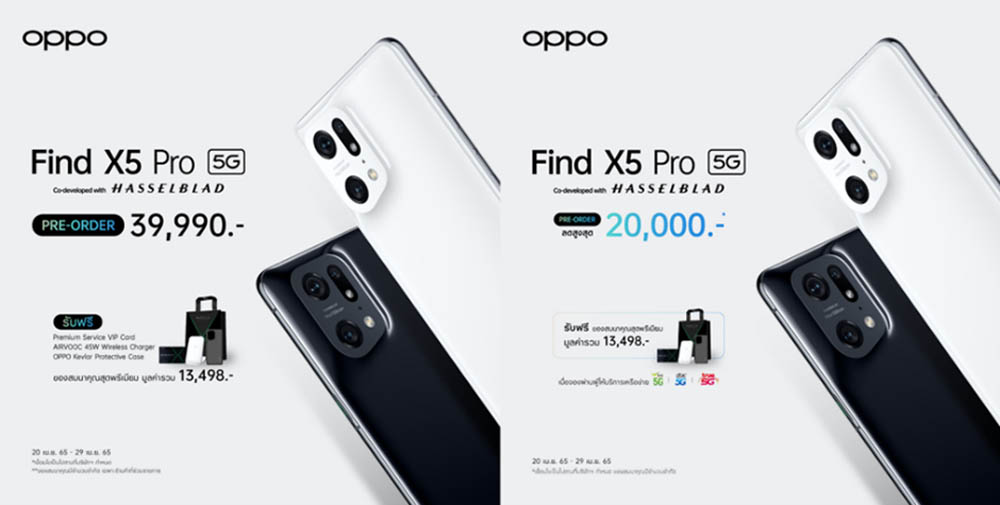 สำหรับ OPPO Find X5 Pro 5G สมาร์ตโฟนแฟลกชิปรุ่นล่าสุดนี้ มาใน 2 สี ได้แก่ สีขาว Ceramic White และสีดำ Glaze Black วางจำหน่ายในราคา 39,990 บาท สามารถพรีออเดอร์ได้ตั้งแต่วันนี้ – 29 เมษายน 2565 พร้อมรับของสมนาคุณ Premium Box Set มูลค่า 13,498 บาท ได้แก่ Premium Service VIP Card ประกันหน้าจอแตก มูลค่า 10,000 บาท, AIRVOOC 45W Wireless Charger 2,499 บาท และ OPPO Kevlar Protective Case มูลค่า 999 บาท โดยจะวางจำหน่ายอย่างเป็นทางการตั้งแต่วันที่ 30 เมษายนเป็นต้นไป ณ OPPO Brand Shop ทุกสาขา และตัวแทนจำหน่ายทั่วประเทศ พิเศษ! ให้คุณเป็นเจ้าของ OPPO Find X5 Pro 5G ได้ง่ายยิ่งขึ้นเมื่อจองผ่านผู้ให้บริการเครือข่าย รับส่วนลดสูงสุดถึง 20,000 บาท