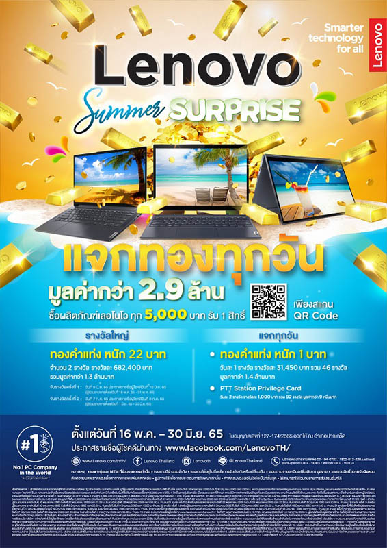 เลอโนโว บริษัทผู้นำด้านคอมพิวเตอร์และสมาร์ทดีไวซ์ระดับโลก นำเสนอเทคโนโลยีเพื่อเสริมประสิทธิภาพทั้งในด้านไลฟ์สไตล์, การทำงาน, และความบันเทิงของผู้คนทั่วโลก จัดเคมเปญ Lenovo Summer Surprise แจกทองคำครั้งใหญ่แห่งปีเพื่อแฟน เลอโนโวทั่วประเทศ เมื่อซื้อผลิตภัณฑ์เลอโนโว โน๊ตบุ๊ค, ออลอินวัน, พีซี, แท็บเล็ต ครบทุก 5,000 บาท ระหว่างวันที่ 16 พ.ค. - 30 มิ.ย. 2565 รับสิทธิในการลุ้นรางวัลทองคำ และอื่น ๆ มูลค่ารวมกว่า 2.9 ล้านบาท โดยยอดซื้อทุก ๆ 5,000 บาท จะได้รับ 1 สิทธิ์ในการลุ้นรับรางวัล* หลังกรอกข้อมูลลงทะเบียนรับสิทธิผ่านทางเว็บไซต์ https://forms.gle/ArhL4M8cRP2X8wBq6 หรือ สแกนคิวอาร์โค้ดตามเอกสารโปรโมชั่นที่ระบุ