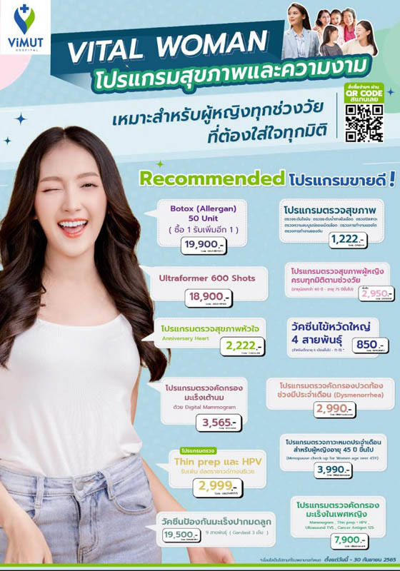 โรงพยาบาลวิมุต อีกระดับของการรักษาด้วยความใส่ใจ เปิดตัวแคมเปญ “VITAL WOMAN” ภายใต้แนวคิด “สุขภาพผู้หญิงทุกช่วงวัย ต้องใส่ใจทุกมิติ” รุกตลาดสุขภาพสตรีเต็มรูปแบบด้วยแพ็กเกจการตรวจร่างกายของคุณผู้หญิงในทุกระดับอายุ โดยสามารถเลือกโปรแกรมที่เหมาะกับไลฟ์สไตล์และความเสี่ยงของแต่ละบุคคลได้ในราคาพิเศษ เริ่มต้นเพียง 1,222 บาท ตั้งแต่วันนี้ถึง 30 กันยายน 2565 รพ.วิมุตเชื่อมั่นว่าแคมเปญ “VITAL WOMAN” ตอบโจทย์ผู้หญิงยุคใหม่ในแต่ละวัยได้ตรงจุด ด้วยกระบวนการวินิจฉัยเชิงลึกที่มีประสิทธิภาพมากกว่าแพ็กเกจการตรวจทั่วไป โดยเฉพาะหลังช่วงการแพร่ระบาดของโควิดที่ทุกคนหันมาใส่ใจสุขภาพมากขึ้น คาดได้ผลตอบรับดีเยี่ยมทั้งจากชาวไทยและชาวต่างชาติที่อาศัยอยุ่ในประเทศ