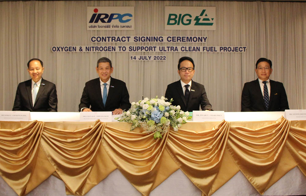 ไออาร์พีซี-บีไอจี บรรลุข้อตกลงร่วมลงนามในสัญญาการผลิตก๊าซไนโตรเจนและออกซิเจนป้อนโรงกลั่น เพื่อสนับสนุนโครงการผลิตน้ำมันสำเร็จรูปเกรดยูโร 5 กำมะถันต่ำ และลดก๊าซเรือนกระจกจากกระบวนการขนส่งและการผลิต รวมมูลค่าสัญญาเกือบสองพันล้านบาท คาดก่อสร้าง แล้วเสร็จตุลาคมปี 2566