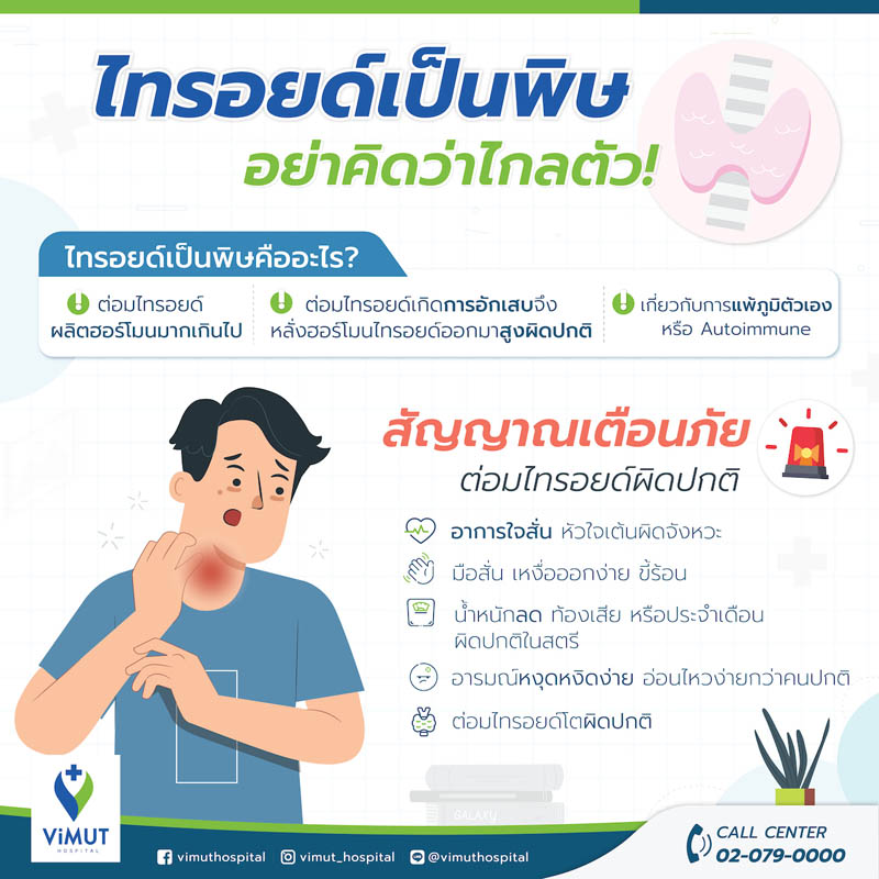 หลายคน ๆ อาจเคยมีเพื่อนหรือคนในครอบครัวที่ป่วยด้วยโรคนี้แล้ว แต่ไทรอยด์เป็นพิษกลับเป็นโรคอีกชนิดหนึ่งที่คนทั่วไปยังอาจไม่เข้าใจว่ามันเกิดจากอะไร อันตรายแค่ไหน หรือใครที่เสี่ยงต่อโรคนี้บ้าง วันนี้ นพ. ปริญญา สมัครการไถ อายุรแพทย์ แพทย์ผู้ชำนาญการโรคเบาหวานและต่อมไร้ท่อ โรงพยาบาลวิมุต จะมาอธิบายอย่างง่าย ๆ ให้เราเข้าใจเกี่ยวกับโรคนี้มากขึ้น แถมวิธีสังเกตอาการที่น่าสงสัยซึ่งอาจนำไปสู่ไทรอยด์เป็นพิษได้