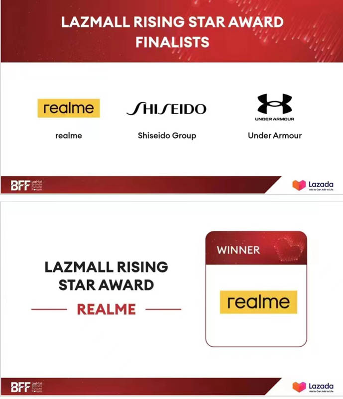 นับเป็นเรื่องน่ายินดีเมื่อพิจารณาจากรายชื่อแบรนด์ที่เข้ารอบสุดท้ายของรางวัล LazMall Rising Star Award ซึ่งได้แก่แบรนด์ยักษ์ใหญ่อย่าง Shiseido Group และ Under Armour รวมถึง realme ซึ่งในที่สุด realme ในฐานะแบรนด์เทคโนโลยีน้องใหม่ก็สามารถเบียดเอาชนะแบรนด์เครื่องกีฬาและแบรนด์สกินแคร์ระดับโลก จนคว้ารางวัลอันทรงเกียรตินี้ไปได้ในที่สุด