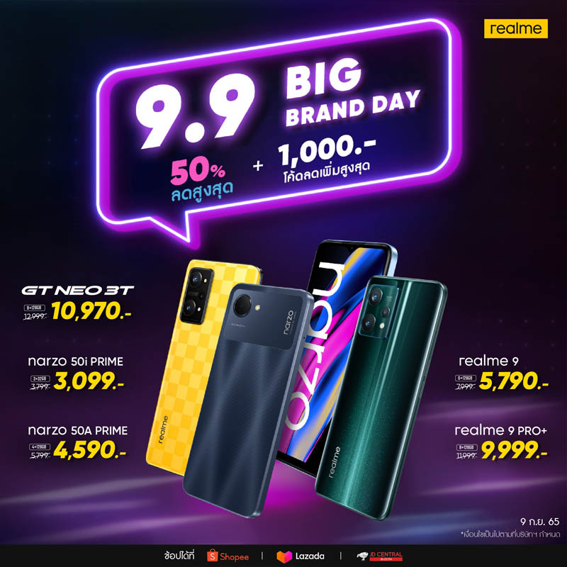 ทั้งนี้ เรียลมียังมอบโปรโมชั่นดี ๆ ผ่านช่องทาง Lazada และช่องทางอีคอมเมิร์ซอื่น ๆ ไม่ว่าจะเป็น Shopee และ JD Central โดยจะมาในเทศกาล “realme 9.9 Big Brand Day” ให้คุณเป็นเจ้าของสมาร์ตโฟนและผลิตภัณฑ์อื่น ๆ จากเรียลมีได้ในราคาที่คุ้มค่ามากยิ่งขึ้นถึง 2 ต่อ โดยต่อที่ 1 ลดกระหน่ำสูงสุดถึง 50% และต่อที่ 2 แจกคูปองส่วนลดสูงสุด 1,000 บาท! ทั้งสมาร์ตโฟนน้องเล็กที่เพิ่งเป็นตัวไปหมาดๆกับ realme narzo 50i Prime มอบความโดดเด่นที่สุดทุกด้านในสมาร์ตโฟนเซกเมนต์เดียวกัน รวมถึงออกแบบ Vertical Stripe Design ที่มาพร้อมกับความหรูหราเพียวบางเพียง 8.4 มม. มอบประสิทธิภาพเร็วแรงเต็มสปีดด้วยซีพียู UNISOC T612 และหน่วยความจำ UFS 2.2 พร้อมกับแบตเตอรี่ขนาดใหญ่ 5000mAh หรือจะเป็น realme 9i 5G เปล่งประกายความงามของโทนสีทองวินเทจ ตอบโจทย์ทุกการใช้งานด้วยขุมพลังชิปเซ็ต Dimensity 810 5G และ realme GT Neo 3T สุดยอดเรือธงแห่งปีที่มาพร้อมขุมพลัง Qualcomm Snapdragon 870 ดีไซน์โฉบเฉี่ยวสไตล์ Racing Flag ที่นำลวดลายจากสนามแข่งขันอันเร้าใจมาสู่สุดยอดดีไซน์สมาร์ตโฟนแห่งปี