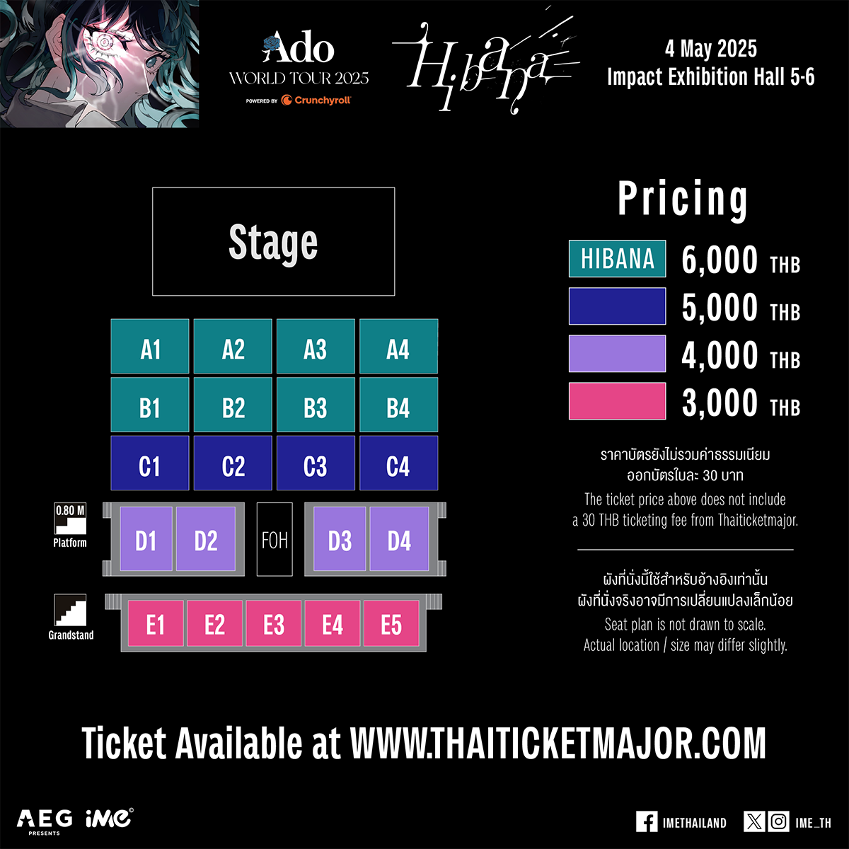 แล้วมาร่วมเป็นส่วนหนึ่งของประสบการณ์ที่ยิ่งใหญ่ในงาน Ado WORLD TOUR 2025 “Hibana” Powered by Crunchyroll in BANGKOK พร้อมมาร่วมสัมผัสความสนุกไปด้วยกันกับ Ado ที่งานนี้ในวันอาทิตย์ที่ 4 พฤษภาคม 2568 ที่ อิมแพ็ค เอ็กซิบิชั่นฮอลล์ 5-6 บัตรราคา HIBANA 6,000 / CAT2 5,000 / CAT3 4,000 และ CAT4 3,000 บาท (บัตรนั่งทุกที่นั่ง) สามารถซื้อบัตรได้ผ่านทาง เคาน์เตอร์ไทยทิคเก็ตเมเจอร์ทุกสาขาหรือ www.thaiticketmajor.com และ Call Center 02-262-3456 หรือติดตามรายละเอียดงานอื่นๆ เพิ่มเติมได้ที่ Facebook @imethailand, IG และTwitter @ime_th #AdoHibana #AdoHibanainBKK #AEG #iMeThailand