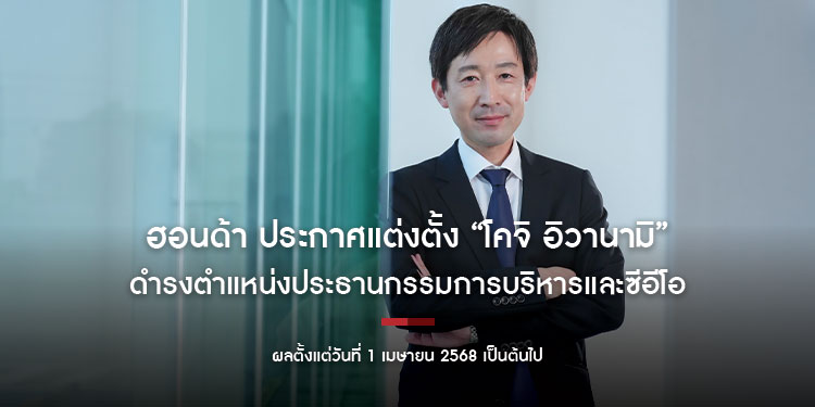 ฮอนด้า ประกาศแต่งตั้ง “โคจิ อิวานามิ” ดำรงตำแหน่งประธานกรรมการบริหารและซีอีโอ ตั้งเป้ามัดใจลูกค้าด้วยการส่งมอบประสบการณ์ขั้นกว่าที่เชื่อมโยงในทุกทัชพอยต์ (Touchpoint) ผ่านการสร้างความเชื่อมั่นในแบรนด์ พร้อมผลิตภัณฑ์ที่หลากหลาย