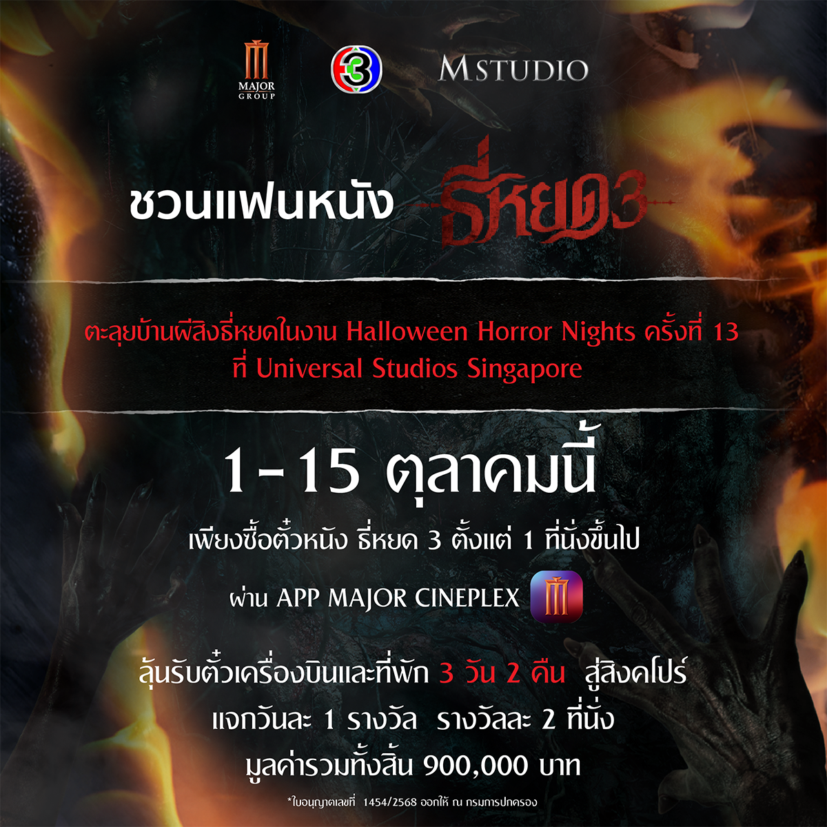 “M STUDIO” และ “ช่อง 3” ชวนแฟนหนังซื้อตั๋วชมภาพยนตร์ “ธี่หยด 3” ระหว่างวันที่ 1–15 ตุลาคมนี้ ลุ้นบินลัดฟ้าสู่สิงคโปร์! ตะลุยบ้านผีสิงธี่หยด