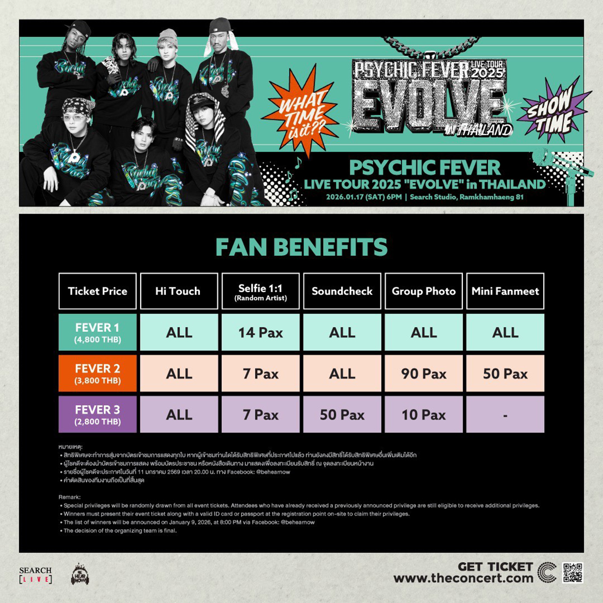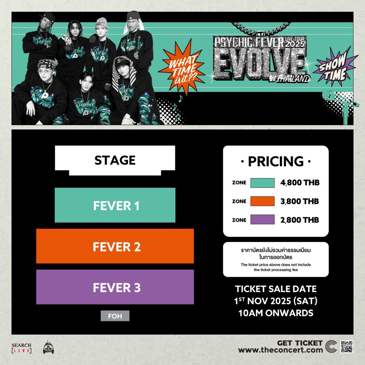 หลังจากห่างหายจากประเทศไทยไปนาน ครั้งนี้หนุ่ม ๆ พร้อมกลับมามอบความสุข ความมัน และความทรงจำให้แฟน ๆ อีกครั้งแบบเต็มอิ่ม! เหล่า ForEVER เตรียมเสียงกรี๊ดไว้ให้พร้อม แล้วมาร่วมเป็นส่วนหนึ่งของประวัติศาสตร์คอนเสิร์ตเดี่ยวของ PSYCHIC FEVER ในไทย ที่จะ “EVOLVE” ทุกหัวใจไปพร้อมกัน! ในวันที่ 17 มกราคม 2569 ณ Search Studio รามคำแหง 81 สามารถซื้อบัตรได้ที่ www.theconcert.com ราคา 4,800 บาท / 3,800 บาท และ 2,800 บาท พร้อมรับสิทธิพิเศษแบบเอ็กคลูซีฟอีกมายมาย สามารถติดตามความเคลื่อนไหวได้ที่ Facebook : Be Hear Now / Search Studio #PCF_EVOLVEinTHAILAND #PSYCHICFEVER #PCFinThailand