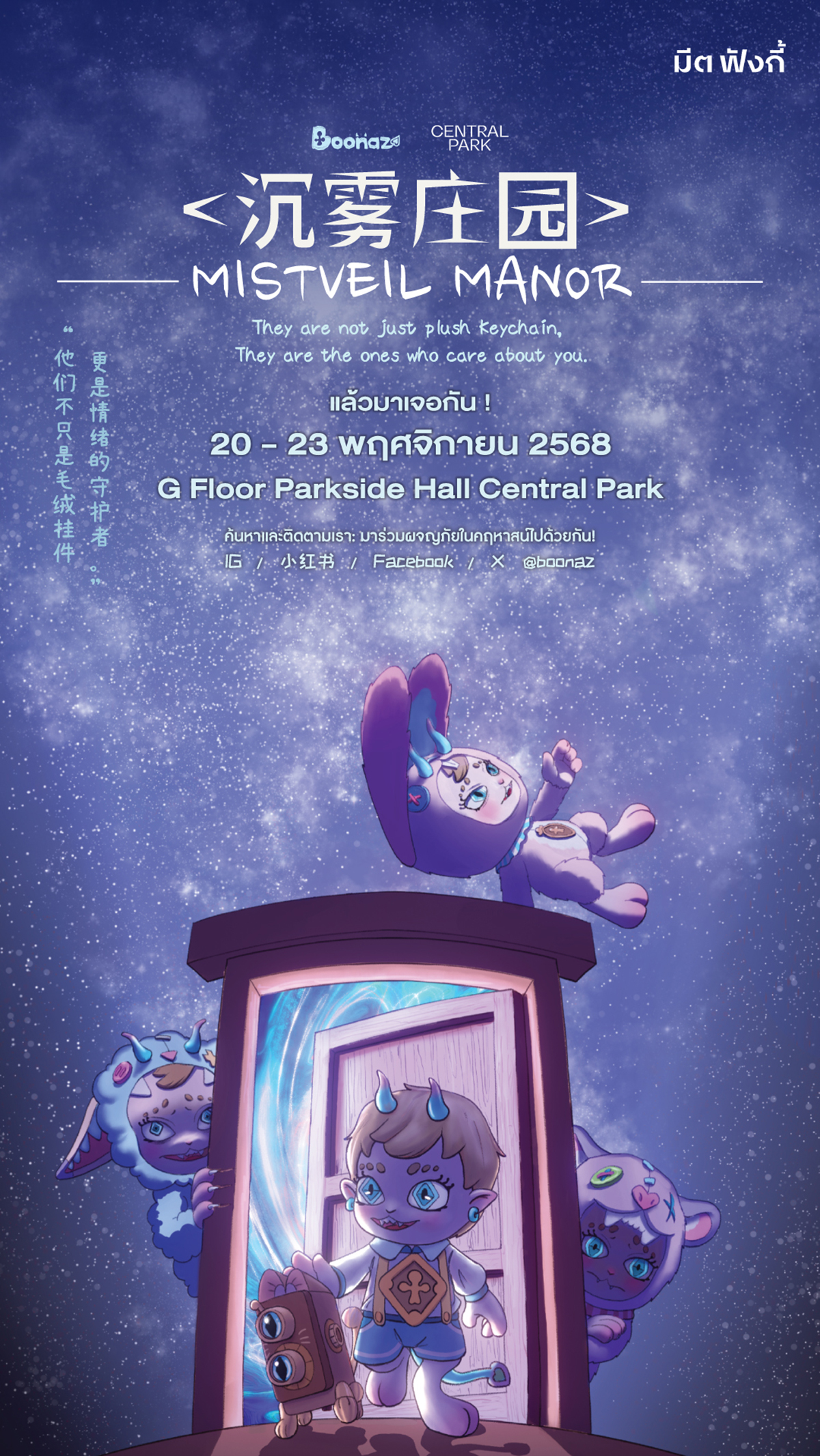 สาวกอาร์ตทอยได้กรี๊ดสนั่น! เมื่อ Boonaz (บูนาซ) แบรนด์คาแรกเตอร์ชื่อดัง มากุมหัวใจชาวไทยด้วยคาแรกเตอร์มอนสเตอร์ตัวน้อยแสนลึกลับ เปิดคอลเลกชันใหม่ “Mistveil Manor Plush Series” ที่ได้ศิลปินระดับโลกและไอคอนอย่าง “แบมแบม กันต์พิมุกต์ ภูวกุล” (BamBam GOT7) มาร่วมถ่ายทอดแนวคิด “The Courage to Express Yourself” (ความกล้าที่จะเป็นตัวเอง) พร้อมเปิดประสบการณ์สุดพิเศษครั้งแรกในประเทศไทย กับ Limited Pop-Up Store ใจกลางกรุงเทพฯ จัดเต็มทั้งกิจกรรมสุดสนุกและสินค้าสุดเอ็กซ์คลูซีฟ ณ พาร์คไซด์ ฮอลล์ ชั้น G, เซ็นทรัล พาร์ค ระหว่างวันที่ 20 - 23 พฤศจิกายน 2568 นี้เท่านั้น