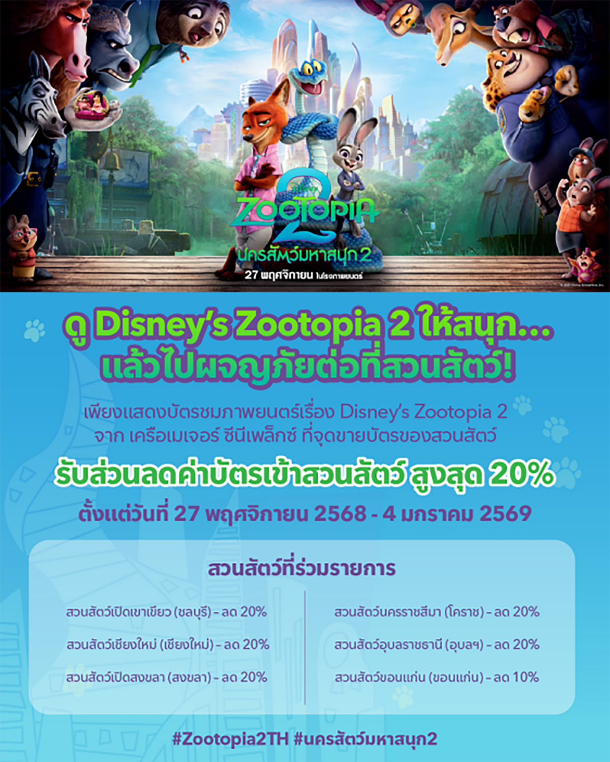 เรียกว่าเอาใจแฟน ๆ แบบสุด ๆ เพราะทันทีที่เข้าฉาย “Disney’s Zootopia 2 นครสัตว์มหาสนุก 2” ก็มอบสิทธิพิเศษให้ผู้ชมด้วยการชวนไปเที่ยวสวนสัตว์ 6 แห่งทั่วไทย ทั้ง สวนสัตว์เปิดเขาเขียว จังหวัดชลบุรี, สวนสัตว์เชียงใหม่, สวนสัตว์นครราชสีมา,สวนสัตว์อุบลราชธานี, สวนสัตว์ขอนแก่น และ สวนสัตว์เปิดสงขลา ด้วยส่วนลดพิเศษ เพียงแสดงบัตรชมภาพยนตร์เรื่อง “Disney’s Zootopia 2 นครสัตว์มหาสนุก 2” ในเครือเมเจอร์ ซีนีเพล็กซ์ รับส่วนลดค่าเข้าสวนสัตว์ทันที