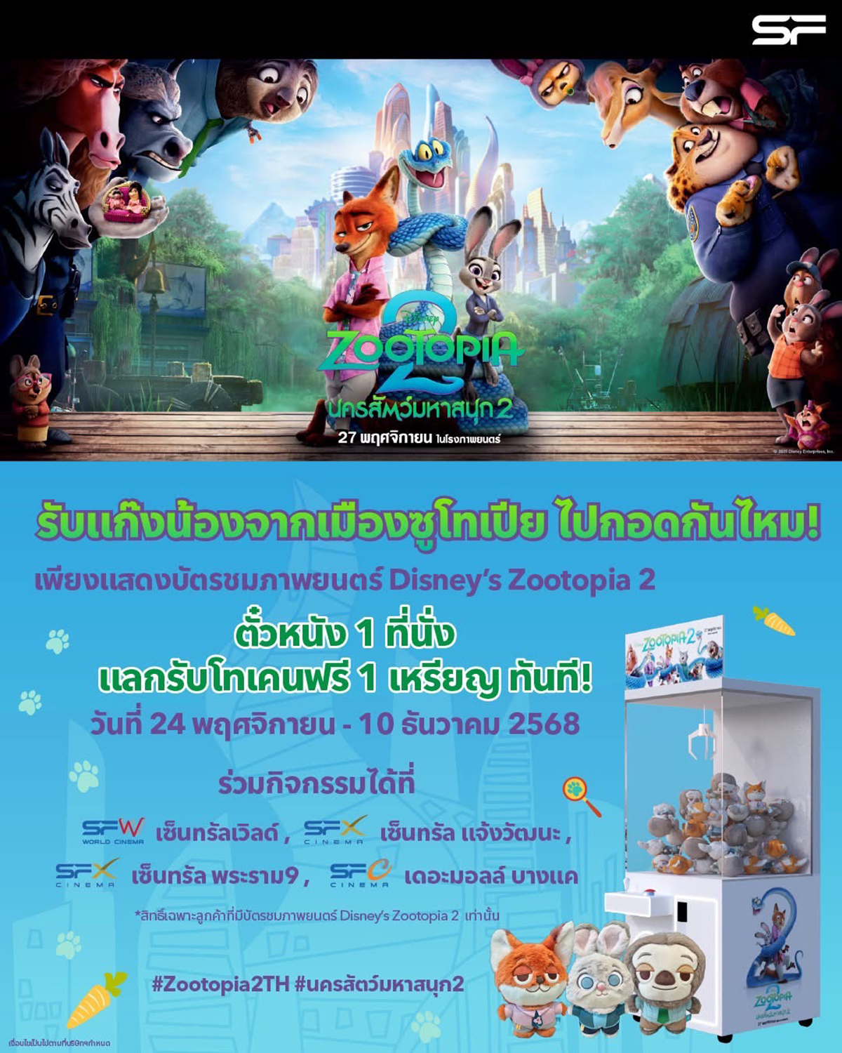 สำหรับแฟน ๆ ชาวกรุงเทพฯ ก็มีความพิเศษให้ได้อินกับการผจญภัยในนครสัตว์ที่ SF World Cinema เซ็นทรัล เวิลด์ ซึ่งจัดมุมถ่ายรูปเก๋ ๆ คู่กับ Judy Hopps, Nick Wilde และ Gary De’Snake รวมถึงยกเอาบ่อบอลที่จำลองมาจากโลกใต้น้ำ พื้นที่ใหม่ที่จะได้เห็นกันในเรื่อง มาไว้ให้เช็กอิน และพิเศษ! เพียงนำบัตรชมภาพยนตร์เรื่อง “Disney’s Zootopia 2 นครสัตว์มหาสนุก 2” ของโรงภาพยนตร์ในเครือ SF Cinema มาแสดง แลกรับเหรียญสำหรับใช้ในบูธถ่ายรูปธีม Zootopia 2 และตู้คีบตุ๊กตาคาแรกเตอร์สัตว์จากภาพยนตร์ ฟรี! 1 เหรียญ / 1 บัตรชมภาพยนตร์ ตั้งแต่วันนี้ - 10 ธันวาคม 2568