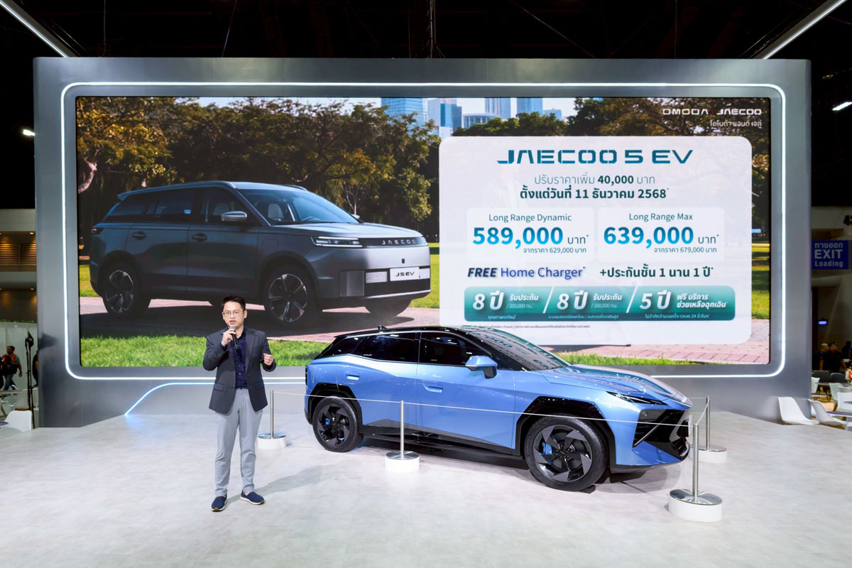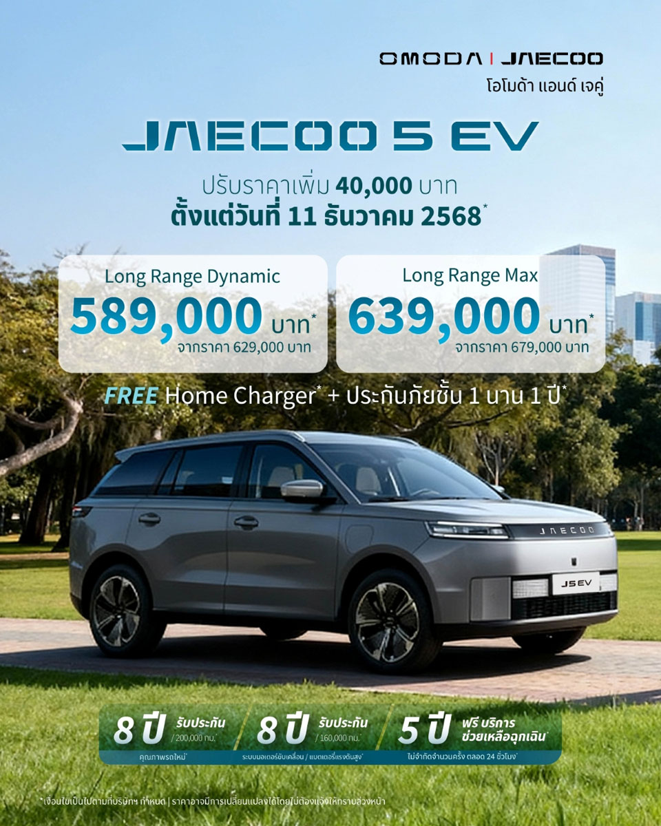คุณบิล จาง ผู้อำนวยการบริหารแบรนด์ OMODA & JAECOO ประเทศไทย กล่าวว่า “ขอขอบคุณลูกค้าทุกท่านสำหรับความไว้วางใจและทุกยอดจองในครั้งนี้ โดยเฉพาะ JAECOO 5 EV ที่มียอดจองเต็มตามโควต้าแล้ว ในโอกาสนี้ เราจึงขอประกาศปรับราคาใหม่สำหรับ JAECOO 5 EV เพื่อให้สอดคล้องกับมาตรการสนับสนุนรถยนต์ไฟฟ้า EV 3.5 โดยรุ่น JAECOO 5 EV Long Range Dynamic 589,000 บาท* จากราคาปกติ 629,000 บาท และรุ่น JAECOO 5 EV Long Range Max 639,000 บาท* จากราคาปกติ 679,000 บาท มีผลตั้งแต่วันที่ 11 ธันวาคม 2568 เป็นต้นไปจนกว่าจะมีการแจ้งเปลี่ยนแปลง ทั้งนี้ เรายังคงเชื่อมั่นว่า JAECOO 5 EV คือหนึ่งในตัวเลือกที่คุ้มค่าที่สุดสำหรับลูกค้าที่ต้องการเป็นเจ้าของรถไฟฟ้าในประเทศไทย”