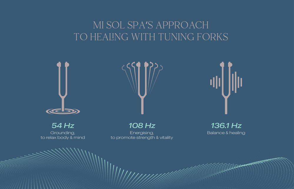 การบำบัดด้วยความถี่เหล่านี้และประโยชน์ที่เกี่ยวข้อง อ้างอิงจากงานวิจัยและคำแนะนำของ Raison d’Etre ที่ปรึกษาด้าน wellness ของ Mi Sol Spa นักบำบัดจะผสานการใช้แรงสั่นสะเทือนจากส้อมเสียงเข้ากับการหายใจ การนวด อโรมาเธอราพี และเสียง เพื่อส่งเสริมการผ่อนคลายอย่างลึกซึ้งและช่วยปลดปล่อยความตึงเครียดทางอารมณ์
