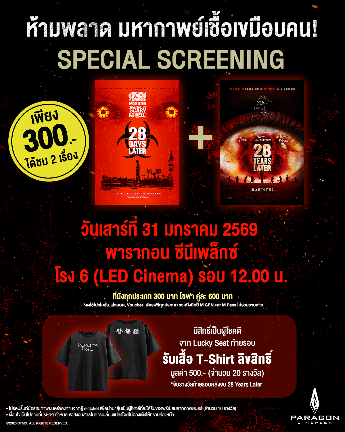 “โซนี่ พิคเจอร์ส เอนเตอร์เทนเมนท์ (ประเทศไทย)” ทำเซอร์ไพรส์แฟนๆแฟรนไชส์ “28 Later” จัดรอบพิเศษแบบ “Double Features” ดู 2 เรื่องควบ “28 Days Later – 28 วันให้หลัง เชื้อเขมือบคน” และ “28 Years Later – 28 ปีให้หลัง เชื้อเขมือบคน” รอบเดียว - วันเดียวเท่านั้น เพื่อเป็นการต้อนรับภาคล่าสุด “28 Years Later: The Bone Temple - 28 ปีให้หลัง เชื้อเขมือบคน: วิหารซากกะโหลก” พร้อมลุ้นรับเสื้อยืด Limited Edition ที่ทำมาเพื่อรอบพิเศษนี้โดยเฉพาะ