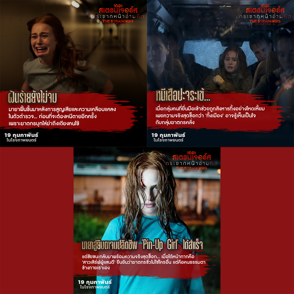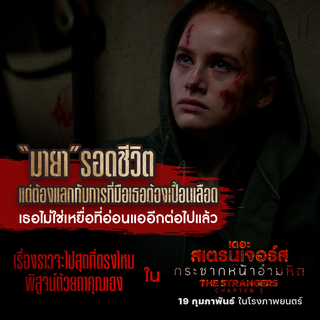 เพราะความตาย... มาเคาะประตูแบบไม่เลือกหน้า! ย้อนรอยความอำมหิต ภาค 1-2 เมื่อทริปหวานกลายเป็นเกมไล่ล่าของ “กลุ่มคนแปลกหน้า” และ “มายา” (แมเดอเลน เพตซ์) หญิงสาวผู้โชคร้าย ต้องกลายเป็นผู้รอดชีวิตเพียงหนึ่งเดียว ทำการบ้านให้พร้อมก่อนไปลุ้นระทึกกับจุดจบใน “The Strangers: Chapter 3 กระชากหน้าอำมหิต” ปัจจิมบทปิดฉากไตรภาคที่จะทวีความรุนแรงยิ่งขึ้น โหดขึ้น สยองขึ้น ระทึกที่สุดในสามภาค และการตัดสินใจของมายาผู้รอดชีวิตเพียงหนึ่งเดียวที่จะทำให้ผู้ชมลุ้นทุกนาทีไปกับจุดจบยันฉากสุดท้าย เมื่อความลับบางอย่างเริ่มปรากฏชัด หน้ากากฆาตกรจะถูกกระชากออกพร้อมปมเบื้องหลังสุดบิดเบี้ยวที่จะถูกเปิดเผยในภาคนี้