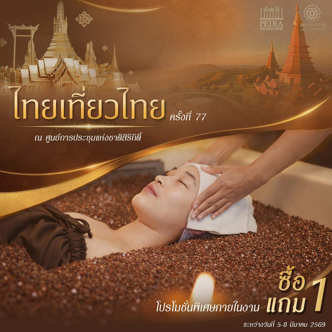 สยาม มารา กรุ๊ป ผู้นำเข้าสปาทรายจากญี่ปุ่นแห่งแรกในประเทศไทยในแบรนด์ Marrakesh Exclusive Spa และ Petra Wellness Center เข้าร่วมงานไทยเที่ยวไทยครั้งที่ 77 พร้อมเสิร์ฟโปรโมชั้นสุดพิเศษ 1 แถม 1 ให้กับคนรักสุขภาพและความงามระหว่างวันที่ 5-8 มีนาคม 2569 ตั้งแต่เวลา 10.00 – 21.00 น. ณ ศูนย์การประชุมแห่งชาติสิริกิติ์ (Hall 5-7) บูธ M18-M19-M20-M41-M42-M43