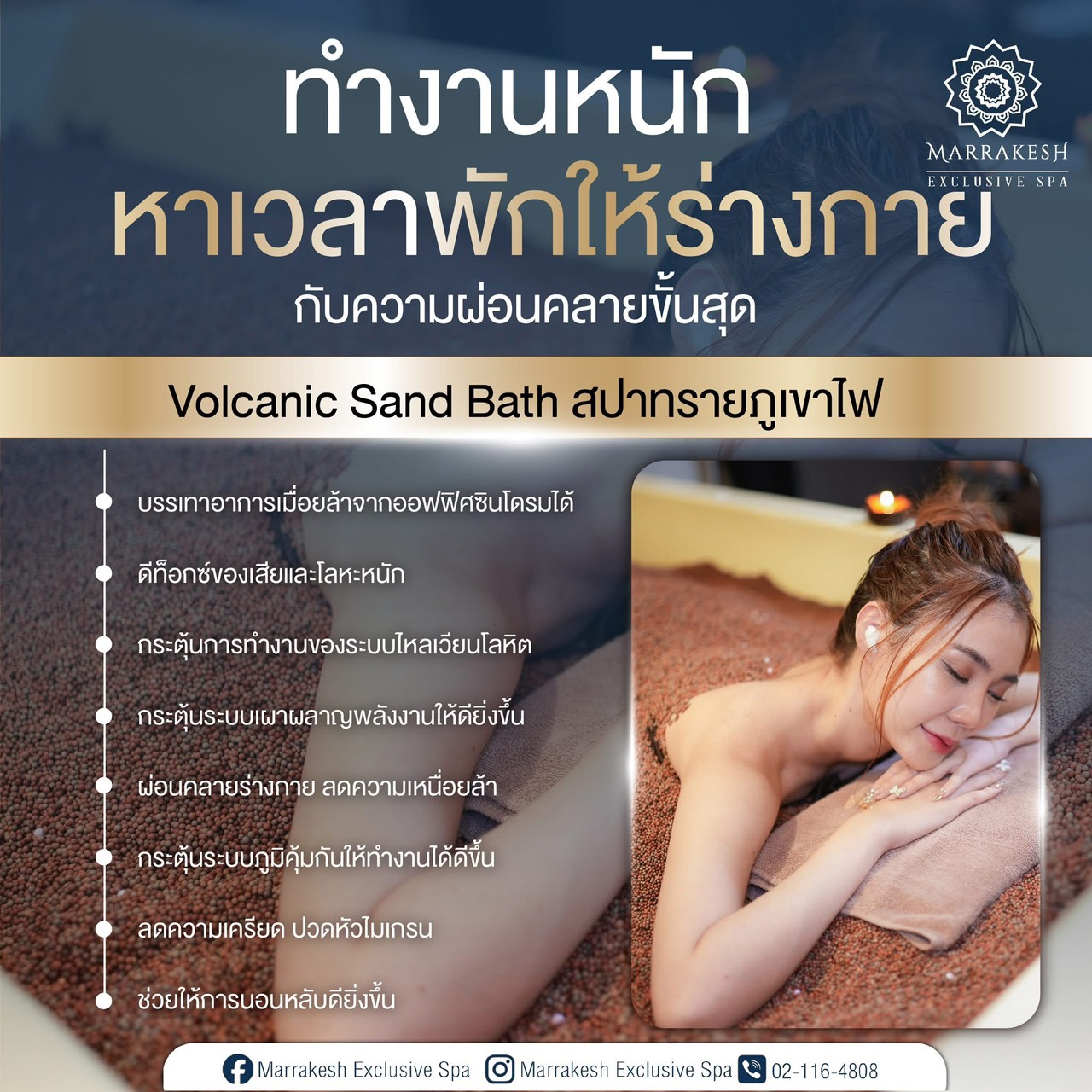 สำหรับโปรโมชั่น 1 แถม 1และโปรแกรมทรีทเม้นท์ของทางร้าน ที่ลูกค้าจะได้รับจากการออกบูธงานไทยเที่ยวไทยครั้งที่ 77มีมากมายอาทิ VOLCANIC SAND BATH หรือ บ่ออายุวัฒนะ ซึ่งเป็นทรายภูเขาไฟที่สั่งตรงจากประเทศญี่ปุ่นแห่งแรกของประเทศไทย พร้อมผลิตภัณฑ์ออร์แกนิค 100 เปอร์เซ็นต์ช่วยปลดล็อคความอ่อนล้า และเสริมสุขภาพแบบครบวงจร การแช่ทรายภูเขาไฟ ประกอบด้วยแร่ธาตุมากกว่า 50ชนิด เช่นแร่ทัวมาลีน แร่เจอมาเนียม และแร่ซิลิก้า เมื่อทรายถูกแช่ด้วยความร้อน จะเกิดปฏิกิริยา ไพโรอิเลคทริค ทำให้เกิด Far Infared ซึ่งพลังงานนี้เปรียบเสมือนแสงแดดยามเช้า เป็นเสมือนประจุไฟฟ้าแห่งชีวิตที่ช่วยต้านอนุมูลอิสระที่เต็มไปด้วยประจุไฟฟ้าอีอ้อนลบ จะทำให้เมเลกุลของเหลวในร่างกายแตกตัวเป็นโมเลกุลเล็กๆ เนื่องจากร่างกายของเรานั้นมีของเสียที่ตกค้างอยู่ภายในร่างกาย ที่เกาะอยู่ตามผนังหลอดเลือดสะสมเป็นจำนวนมาก จนเกิดเป็นสารพิษ พลังงานไพโรอิเลคทริคนี้จะทำให้โมเลกุลเล็กๆ สามารถขับออกมาในรูปแบบของเหงื่อ