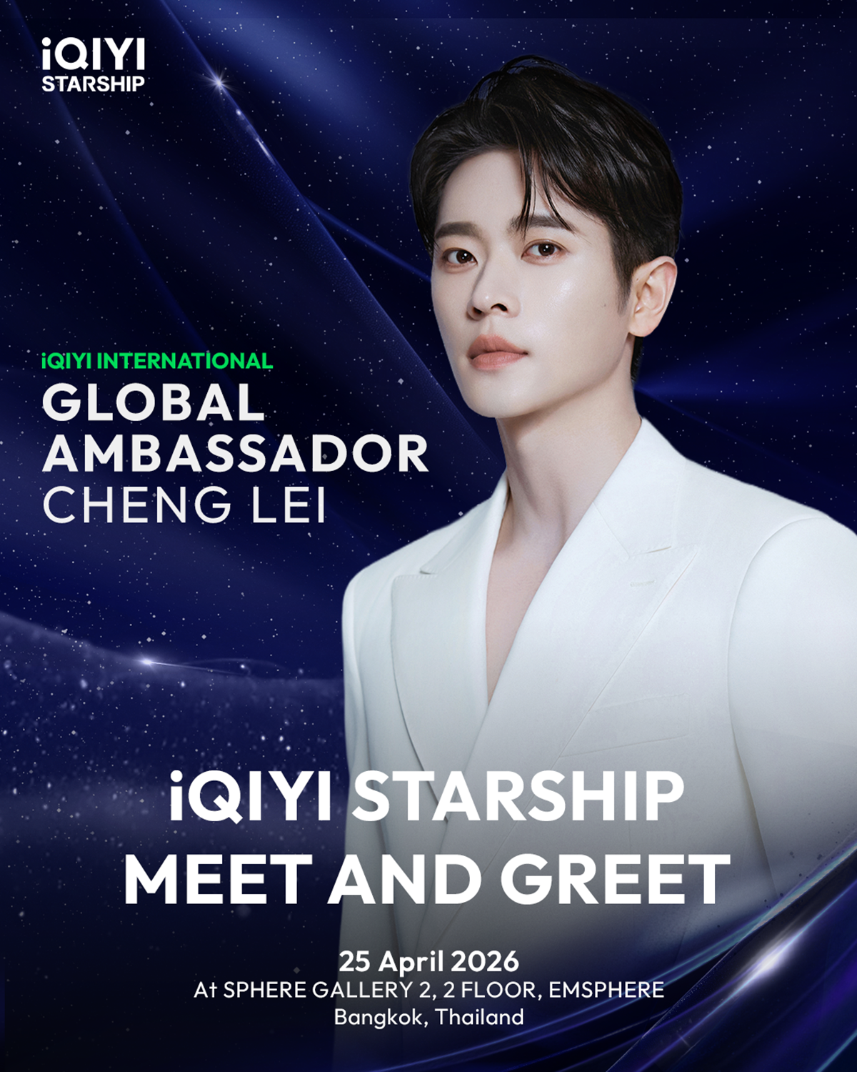 iQIYI International ประกาศข่าวดีอย่างเป็นทางการ ให้แฟน ๆ ในประเทศไทยกรี๊ดสุดเสียง กับงาน 2026 iQIYI Starship Meet and Greet in Thailand IQIYI INTERNATIONAL GLOBAL AMBASSADOR “CHENG LEI” ในวันเสาร์ที่ 25 เมษายน 2569 โดยมี “เฉิงเหล่ย” (Cheng Lei) iQIYI International Global Ambassador คนล่าสุด จะเดินทางมาร่วมกิจกรรมสุดเอ็กซ์คลูซีฟในประเทศไทยเป็นครั้งแรก ณ Sphere Gallery 2 ศูนย์การค้า Emsphere เพื่อพบปะแฟน ๆ ชาวไทยอย่างใกล้ชิด