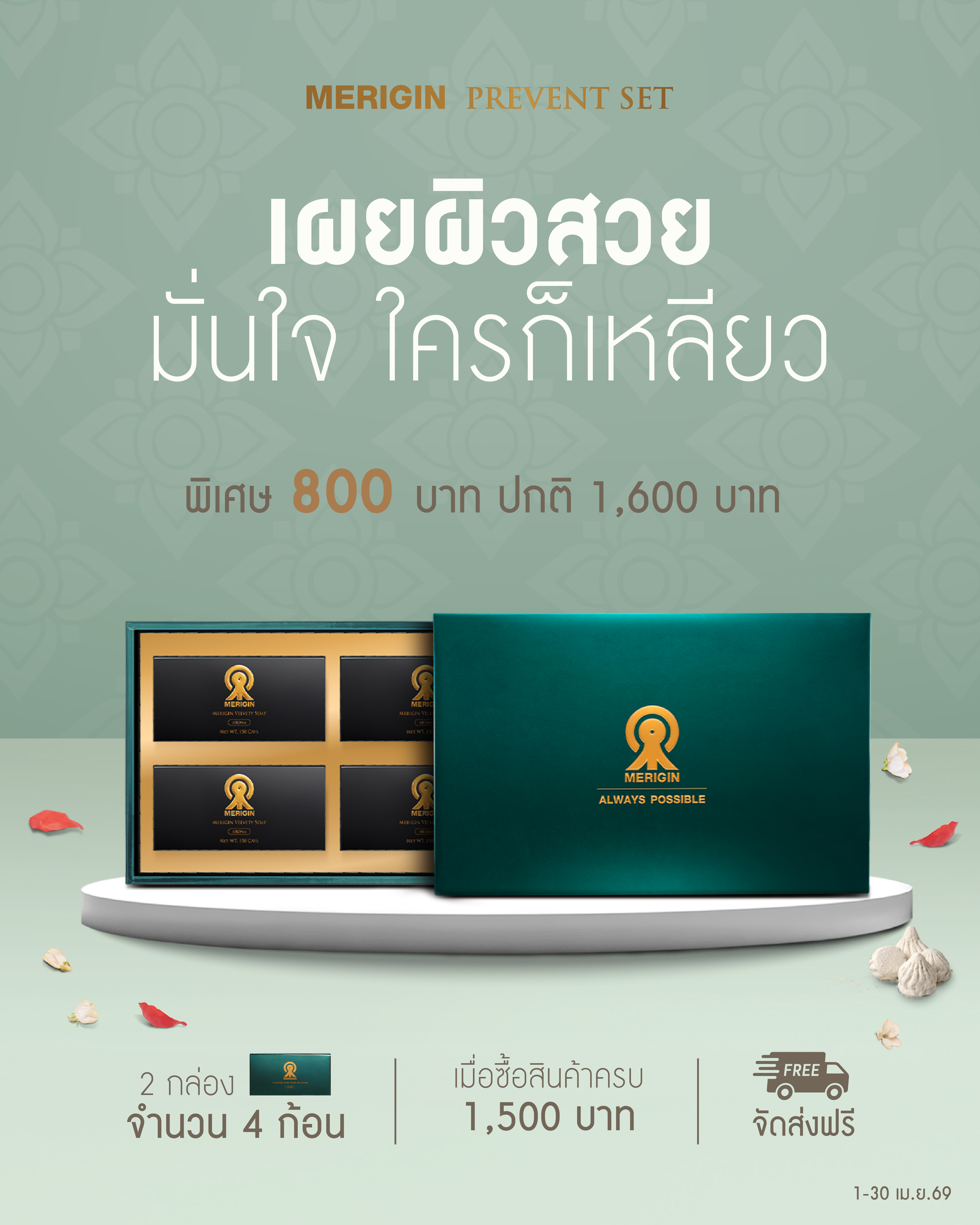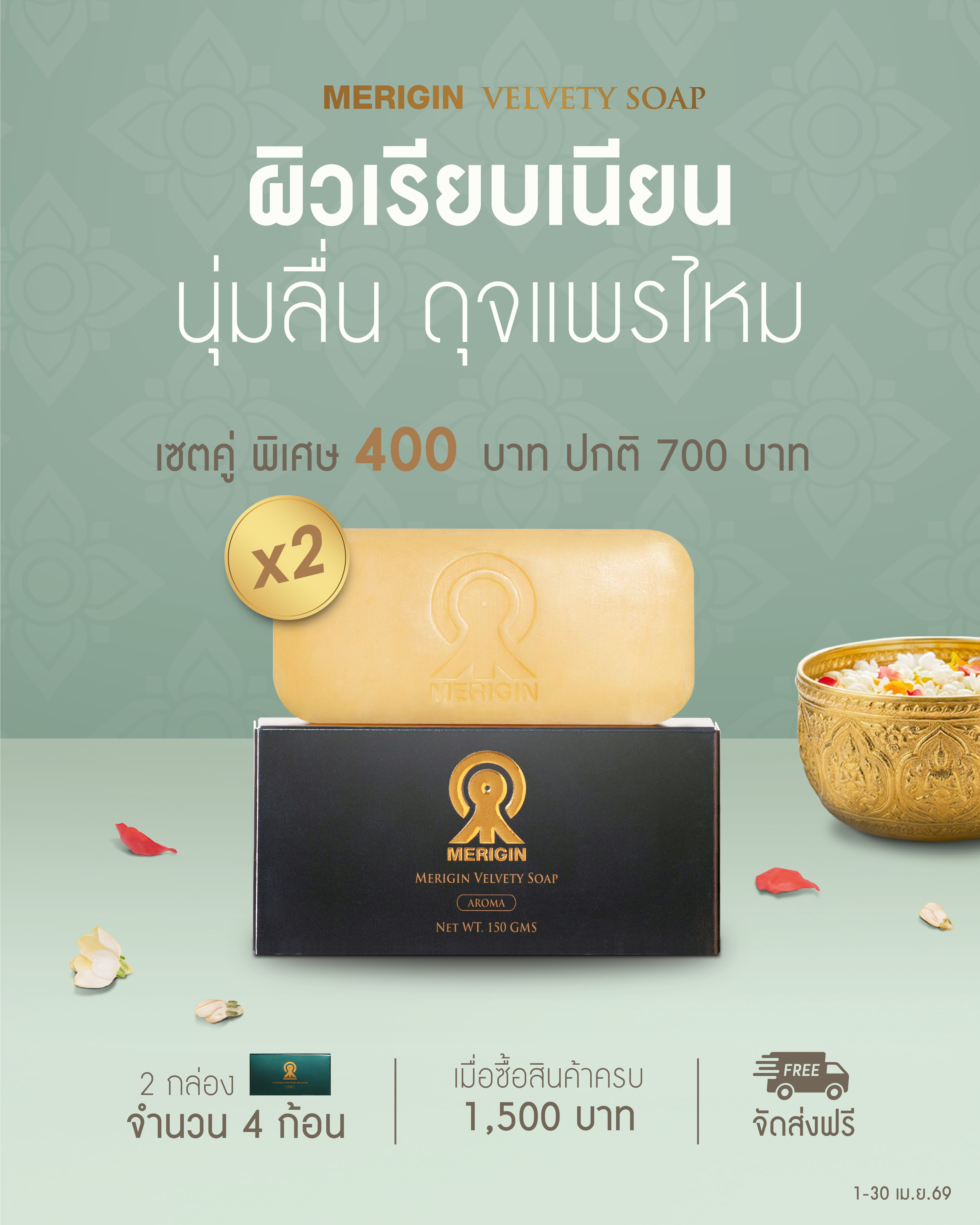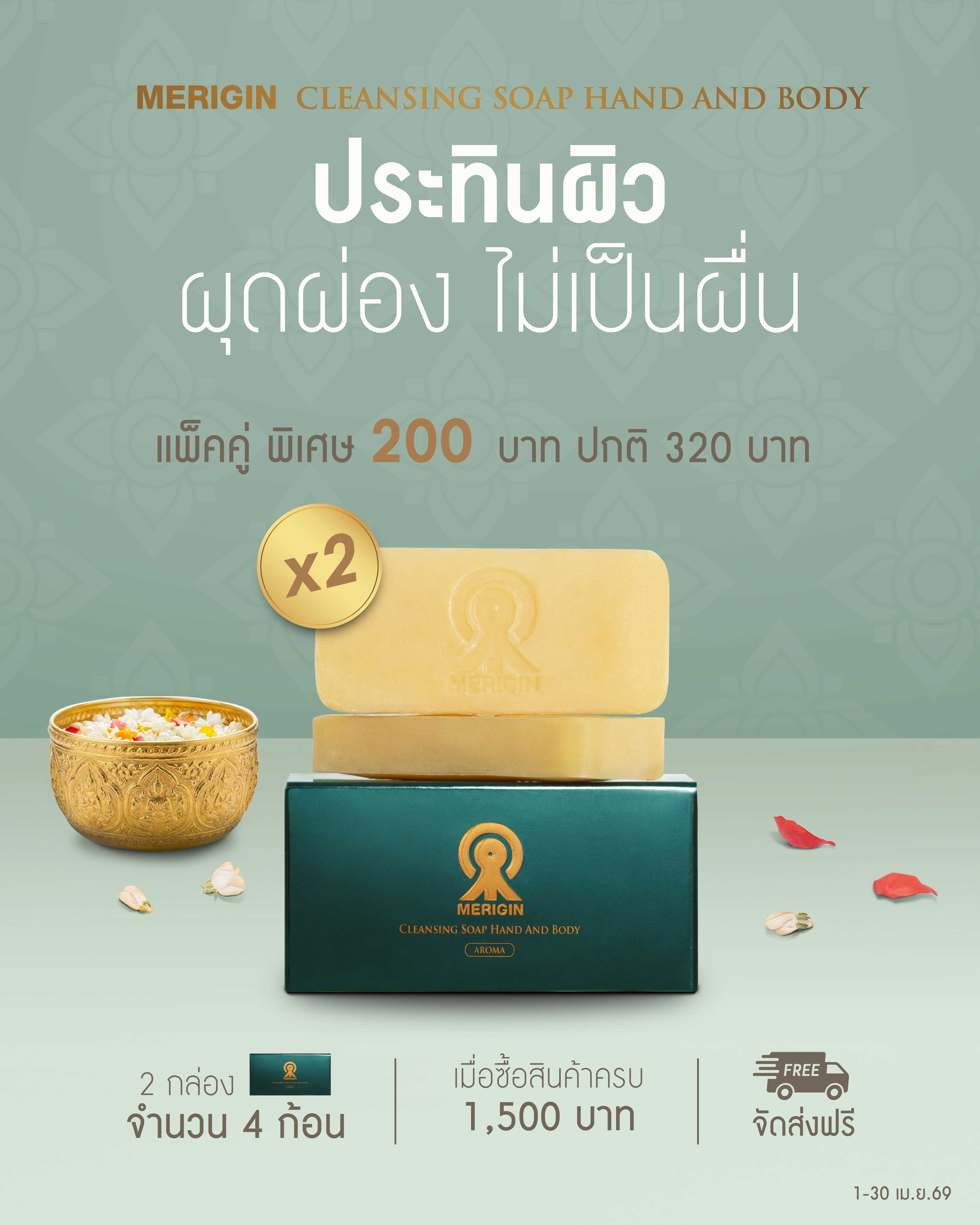 โปรโมชั่นพิเศษต้อนรับเทศกาลสงกรานต์ ตั้งแต่วันที่ 1-30 เมษายน 2569 เมื่อซื้อผลิตภัณฑ์เมอรจิ้นครบ 1,500 บาทรับ โชคสองต่อ ทั้งรับเพิ่มทันที Merigin Cleansing Soap Hand&Body 2 กล่องจำนวน 4 ก้อน ( มูลค่า 320 บาท ) และส่งฟรีไม่มีค่าใช้จ่าย สามารถดูรายละเอียดเพิ่มเติมได้ที่ www.merigin.in.th และ FB : Merigin Thailand