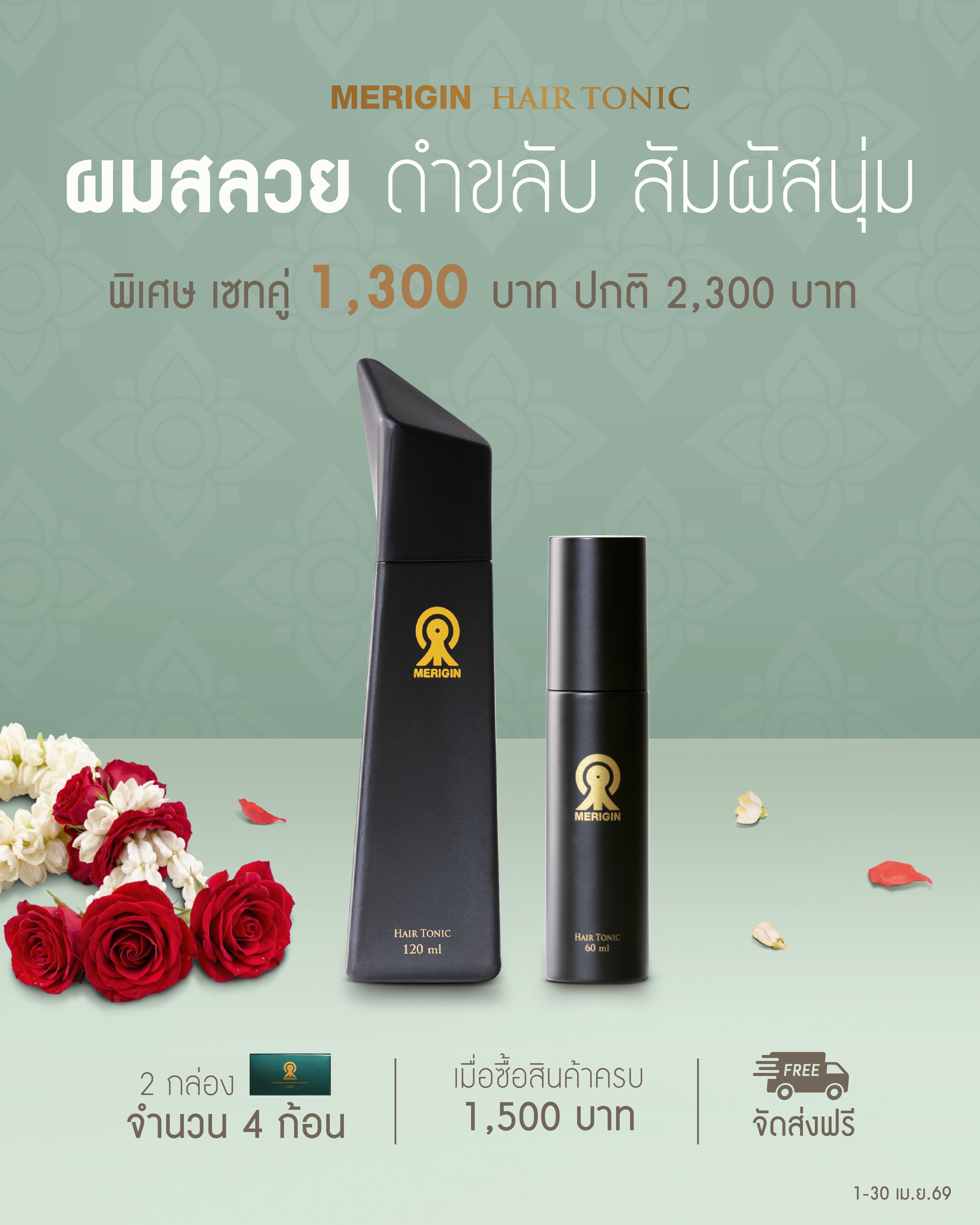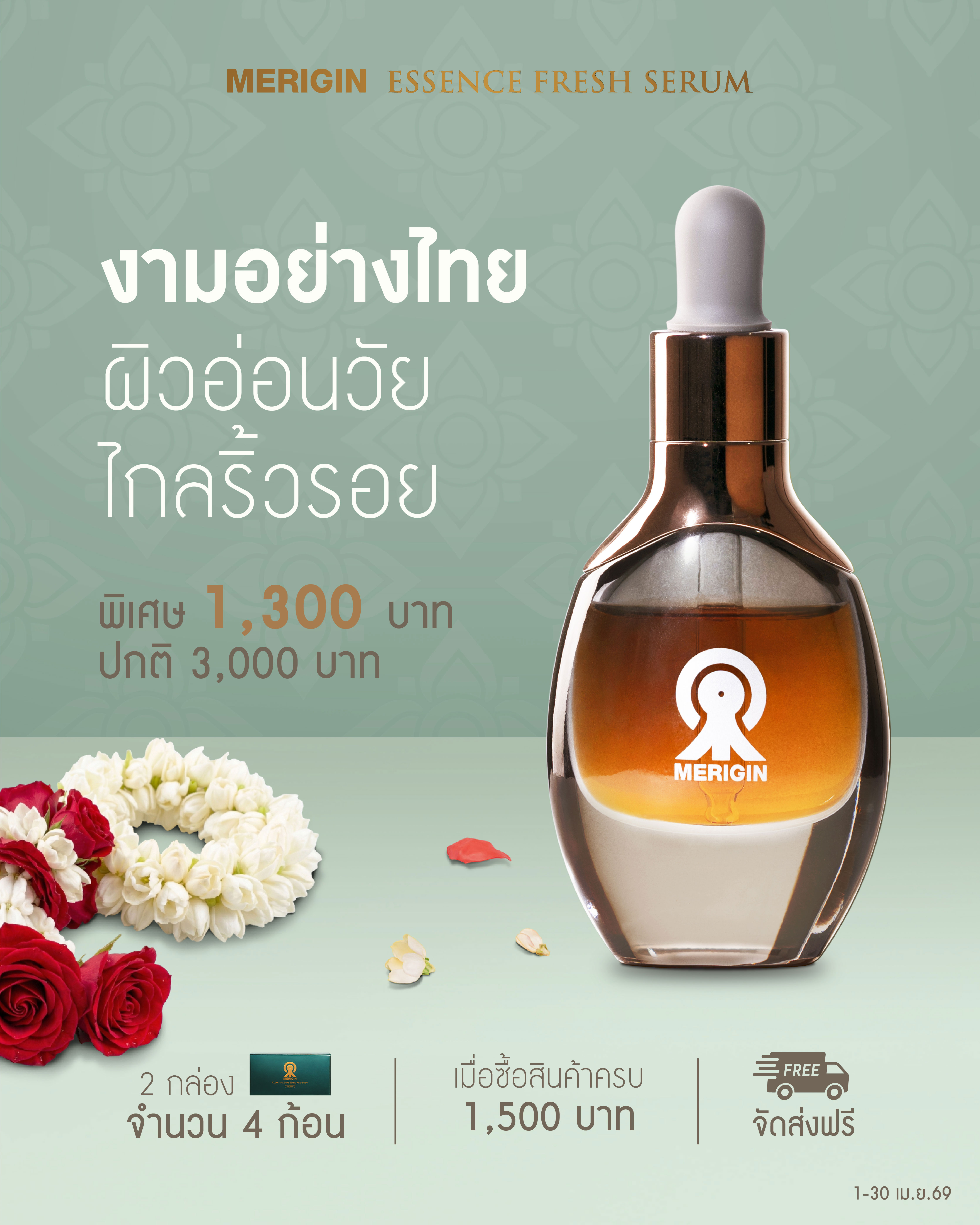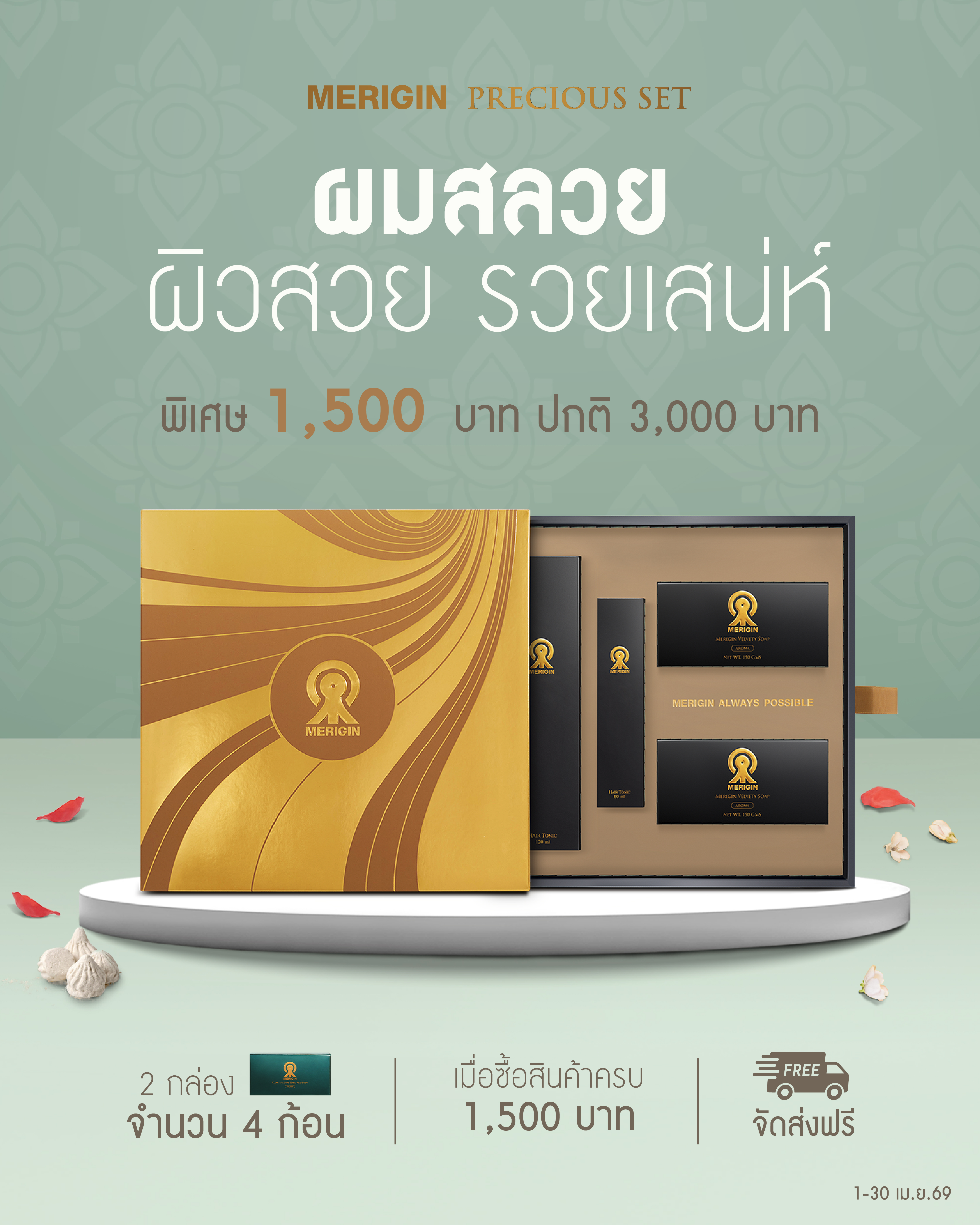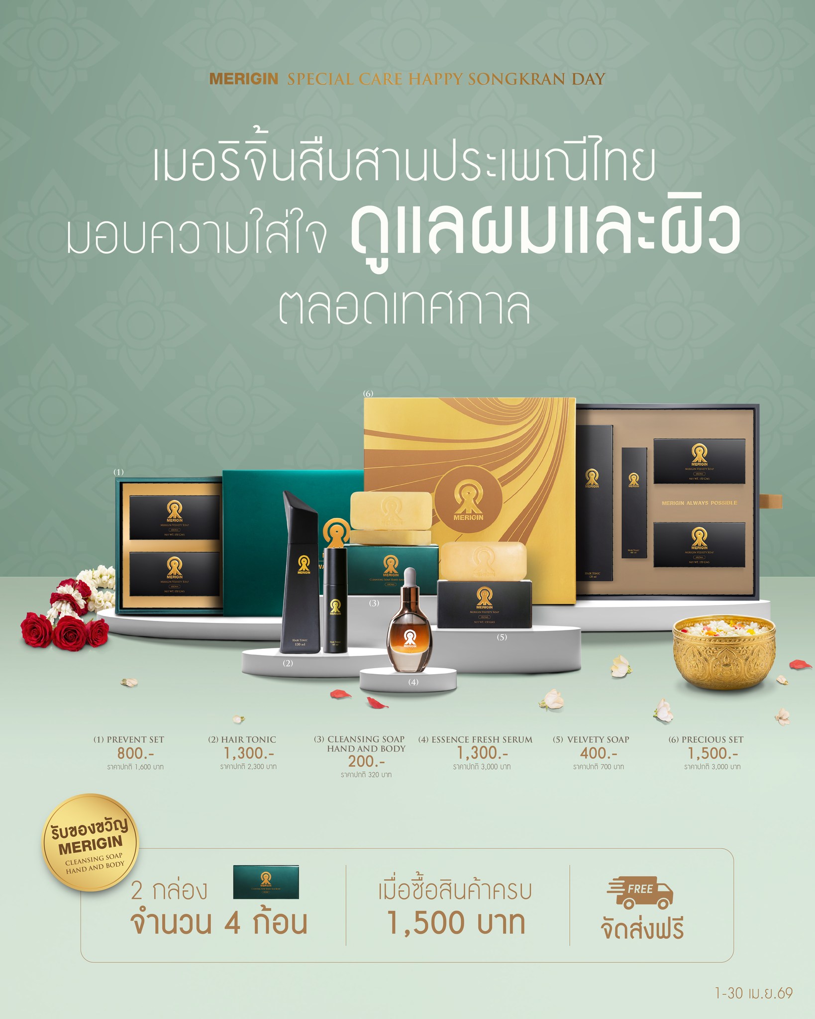 โปรโมชั่นพิเศษต้อนรับเทศกาลสงกรานต์ ตั้งแต่วันที่ 1-30 เมษายน 2569 เมื่อซื้อผลิตภัณฑ์เมอรจิ้นครบ 1,500 บาทรับ โชคสองต่อ ทั้งรับเพิ่มทันที Merigin Cleansing Soap Hand&Body 2 กล่องจำนวน 4 ก้อน ( มูลค่า 320 บาท ) และส่งฟรีไม่มีค่าใช้จ่าย สามารถดูรายละเอียดเพิ่มเติมได้ที่ www.merigin.in.th และ FB : Merigin Thailand