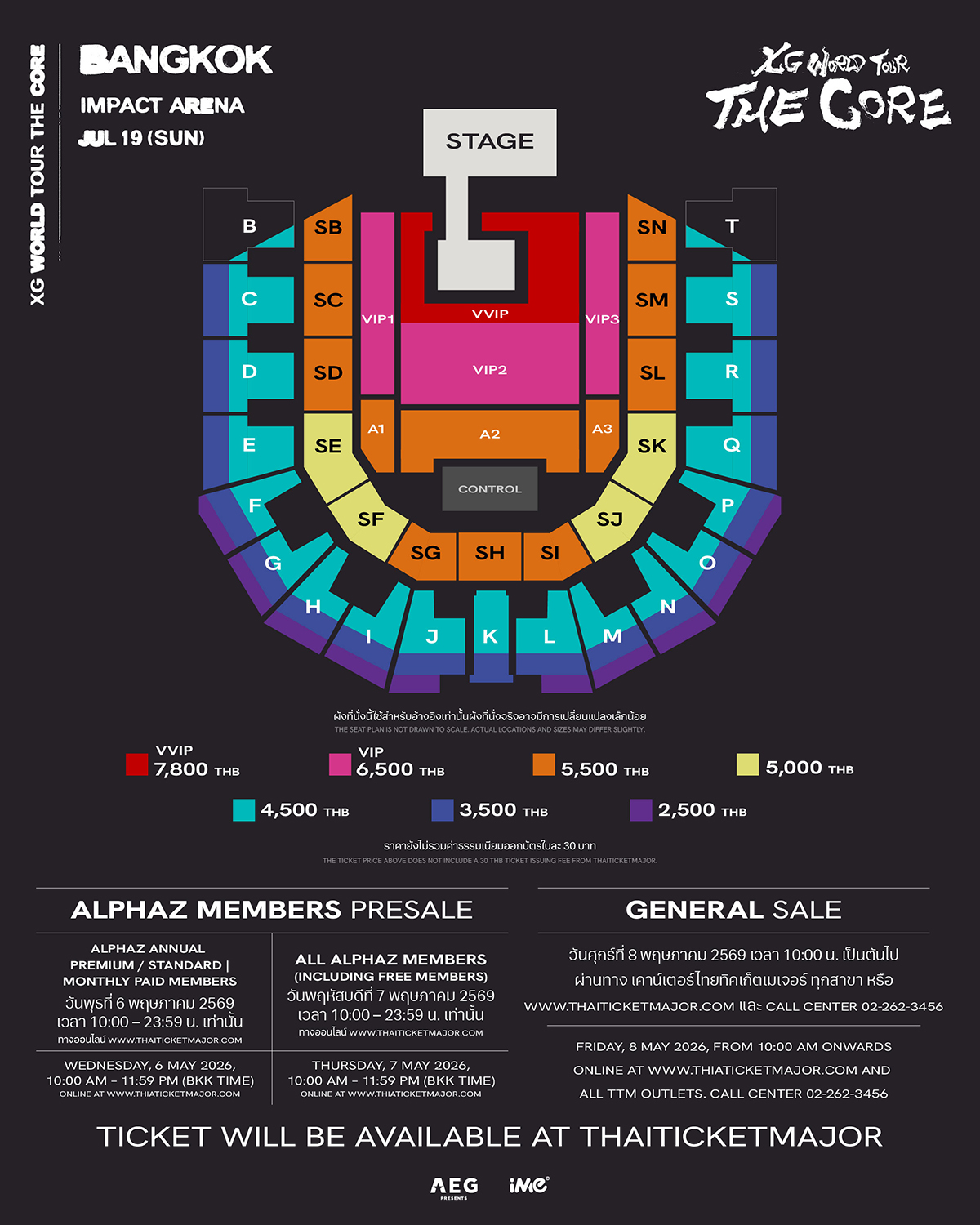 ผู้จัด “เออีจี พรีเซ้นต์ เอเชีย” (AEG Presents Asia) ร่วมกับ “ไอมี่ไทยแลนด์” (iMe Thailand) พร้อมแล้วที่จะพา ALPHAZ ชาวไทย เข้าสู่ใจกลางจักรวาลของ XG ในงาน XG WORLD TOUR: THE CORE IN BANGKOK ซึ่งจะจัดขึ้นในวันอาทิตย์ที่ 19 กรกฎาคม 2569 เวลา 19.00 น. ณ อิมแพ็ค อารีน่า เมืองทองธานี